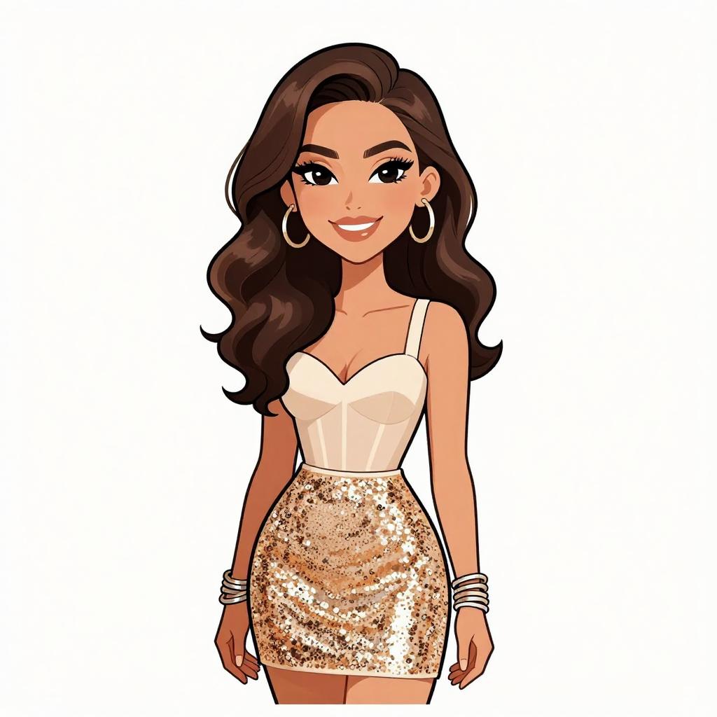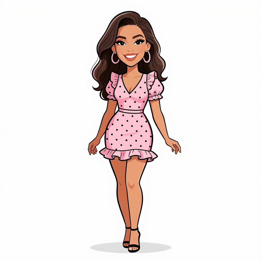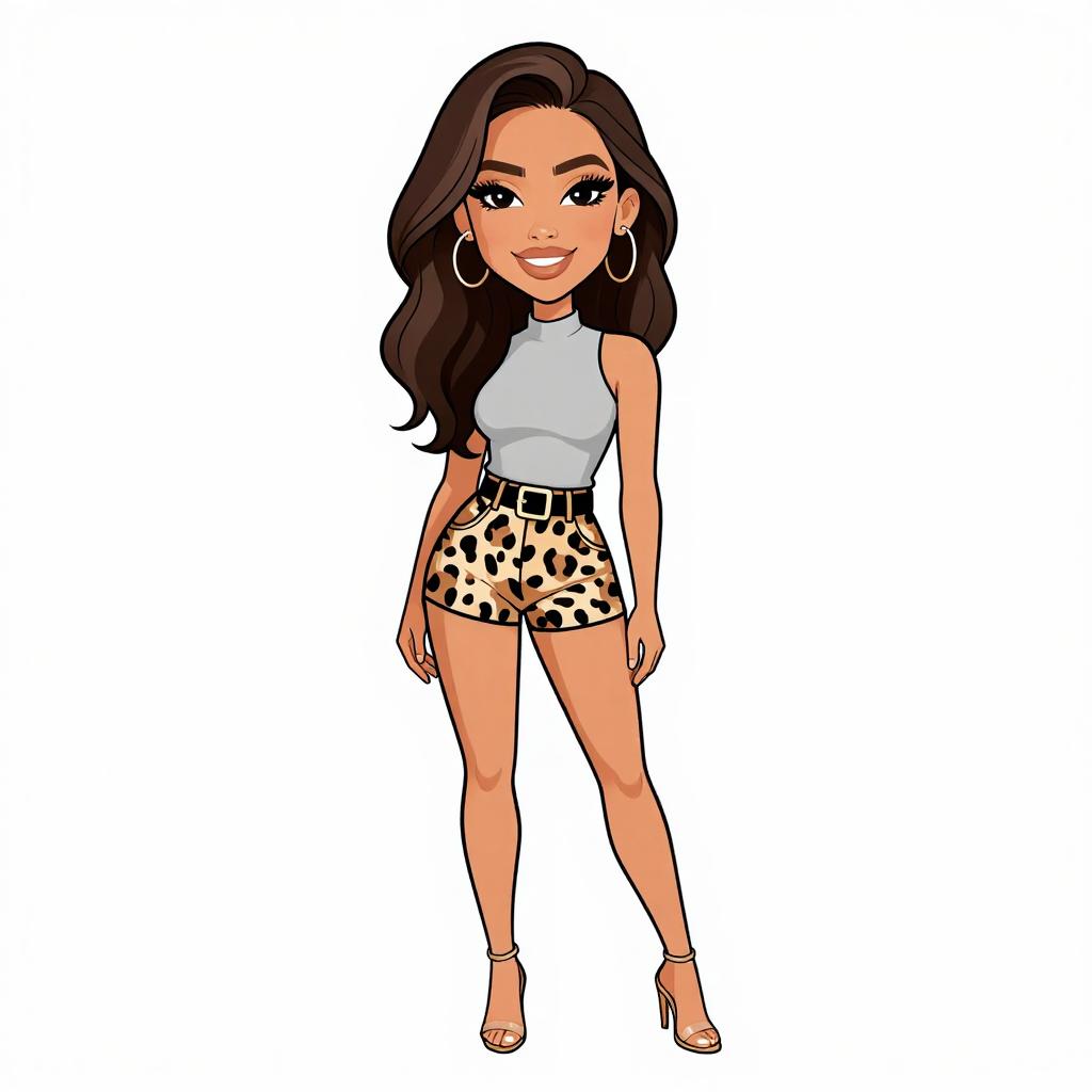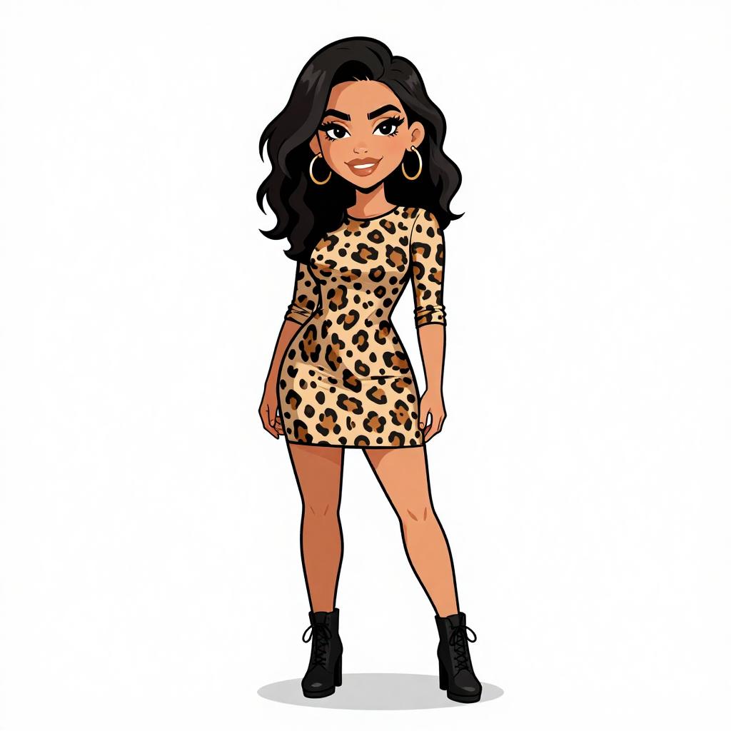 Woman with pretty face and pretty hair. smiling Woman, casual chic, asymmetrical mini dress with animal print in black and beige, v-neckline, spaghetti straps, ruffled hem, layered bangle bracelets in various metallic finishes, white background. --sref 1467