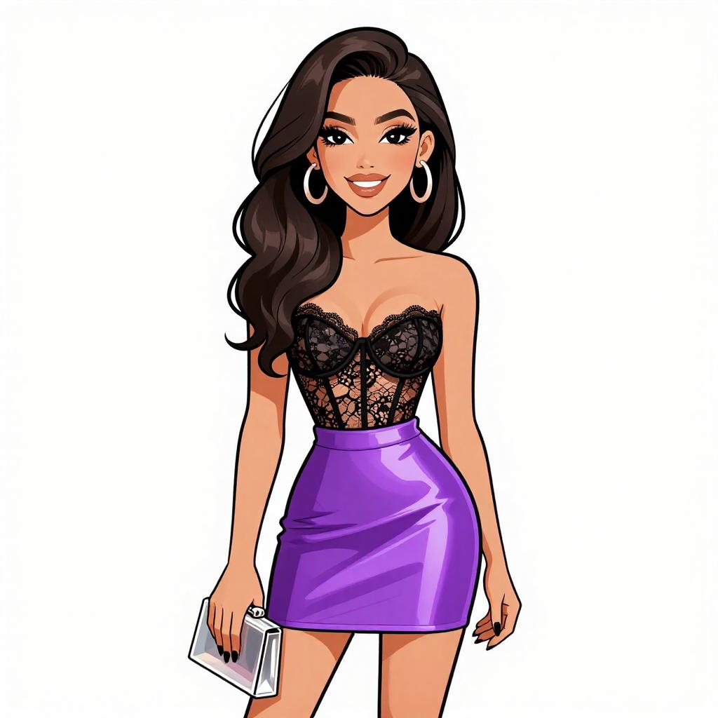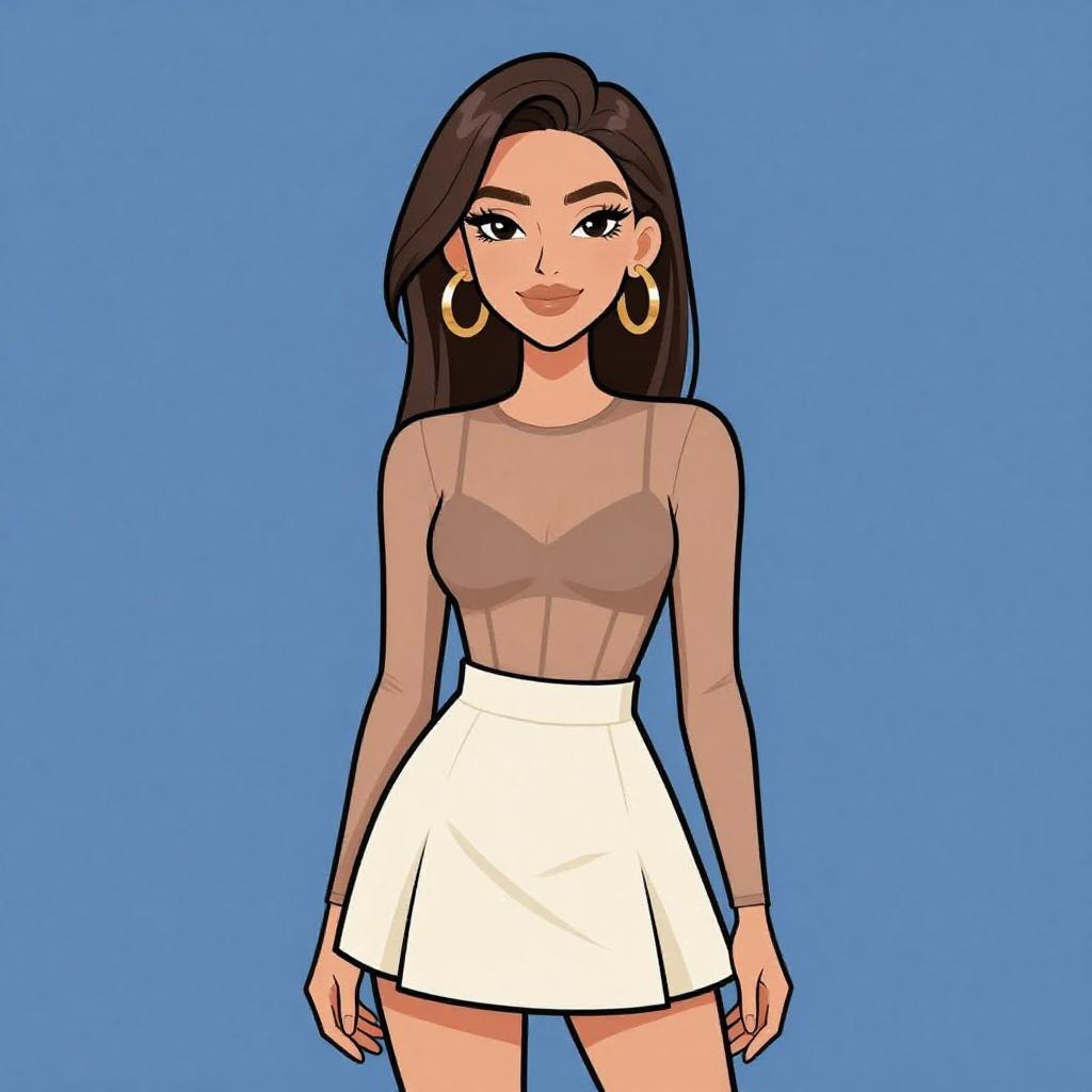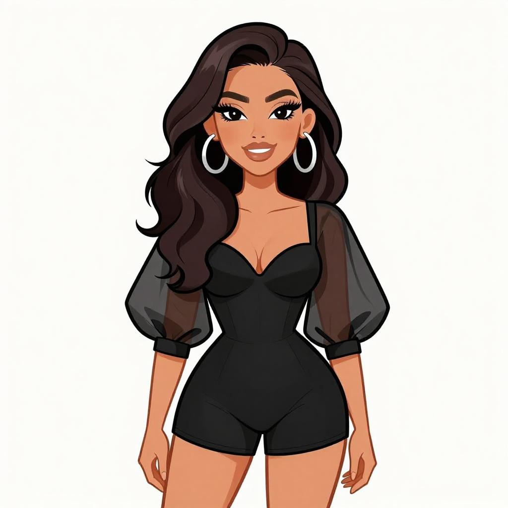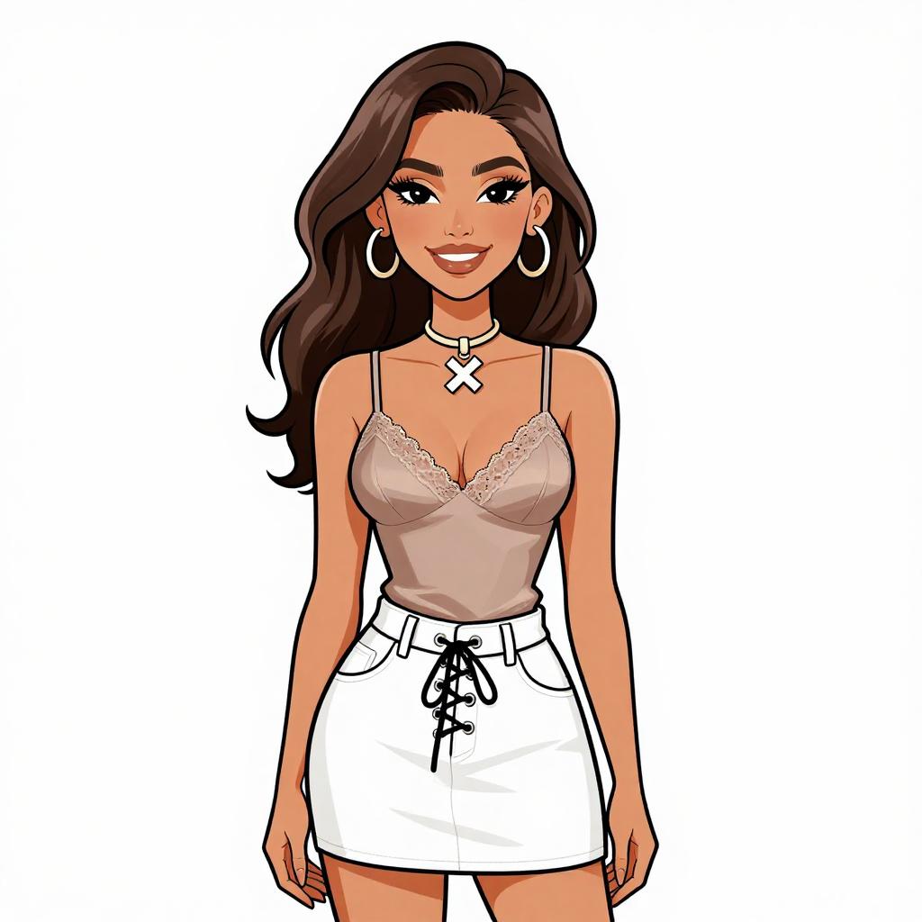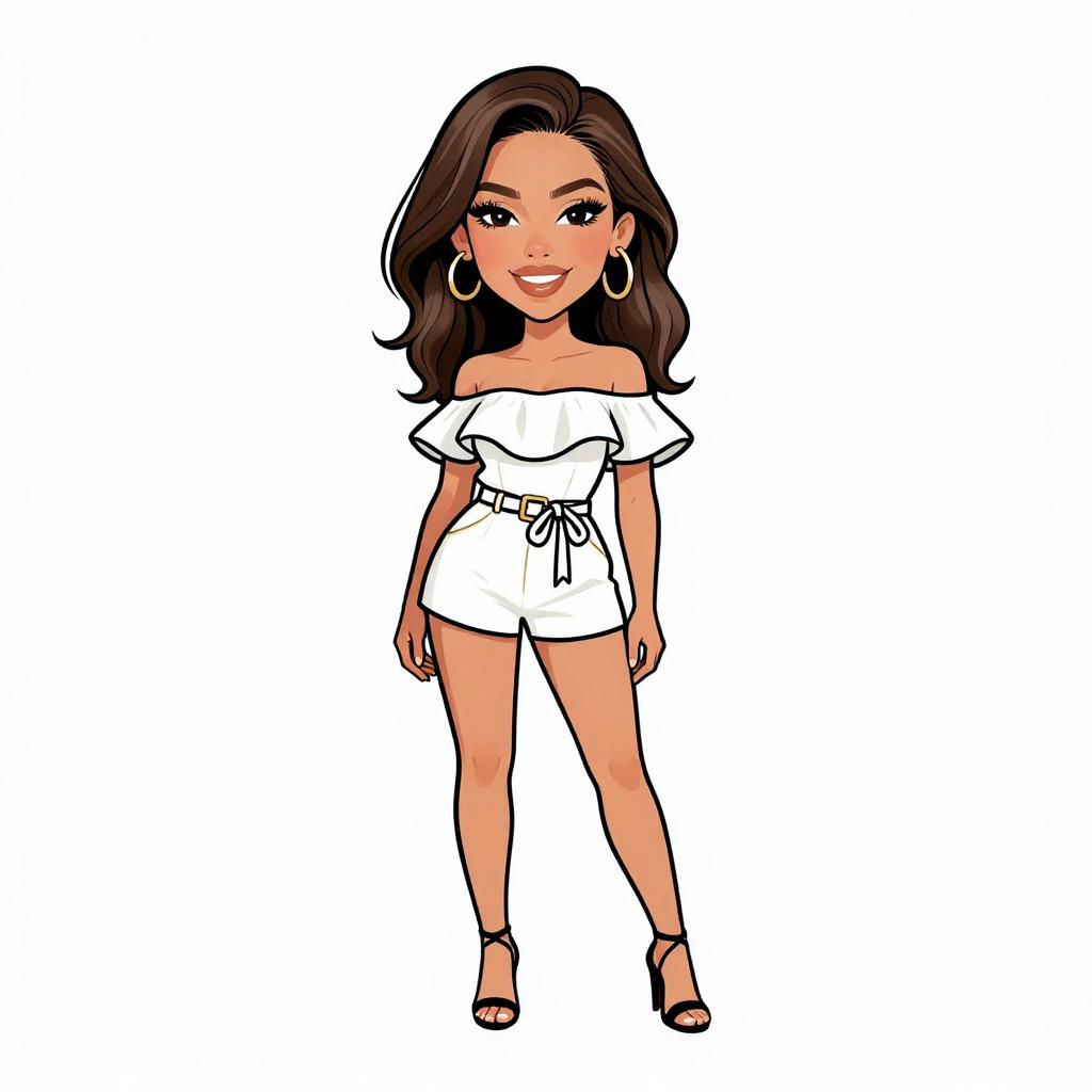 Woman with pretty face and pretty hair. smiling Woman, casual chic, asymmetrical mini dress with animal print in black and beige, v-neckline, spaghetti straps, ruffled hem, layered bangle bracelets in various metallic finishes, white background. --sref 1467