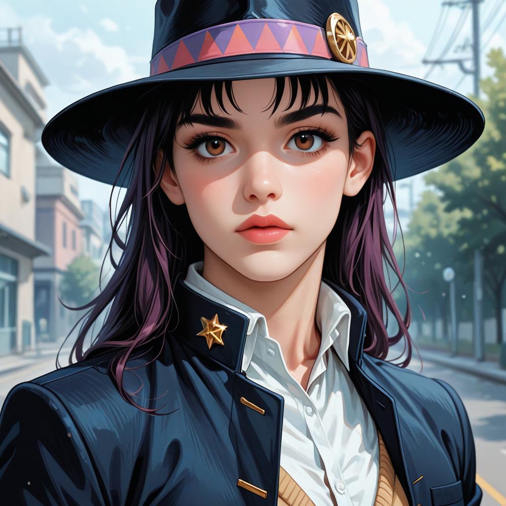Portrait of a young woman with long dark hair featuring purple highlights, wearing a navy blue military-style jacket with gold star insignias and gold buttons. She has a dark blue wide-brimmed hat decorated with a pink band, a red jewel, and a feather. The background suggests an indoor setting with soft natural light coming through the windows.