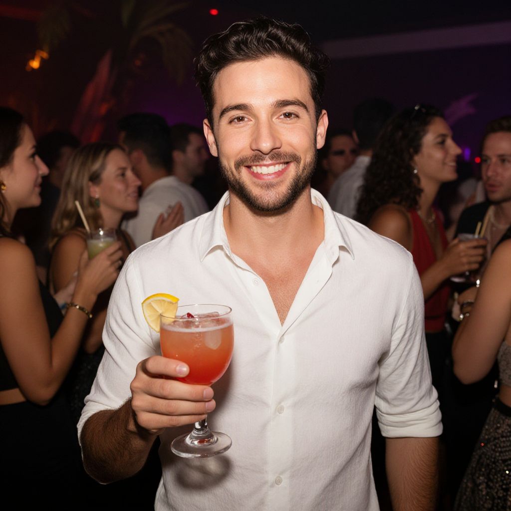 A stylish man with a charming smile holding a cocktail at a vibrant party, surrounded by a crowd of people enjoying a festive atmosphere.