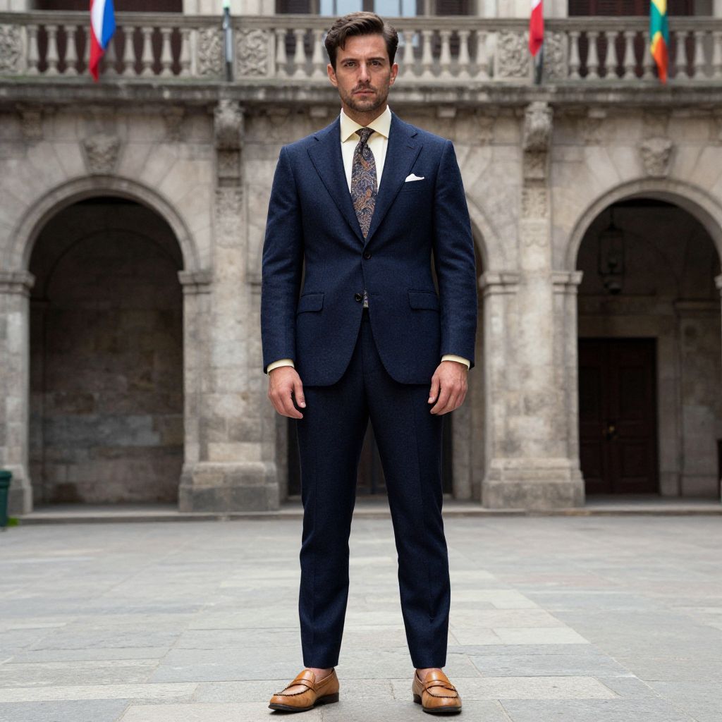 A man, navy blue herringbone suit, tailored jacket, tapered trousers, soft cream dress shirt, paisley silk tie, tan leather loafers, historic stone archways, intricate carvings, flag-draped balconies, medium format film, confident expression. Man has masculine face and piercing eyes