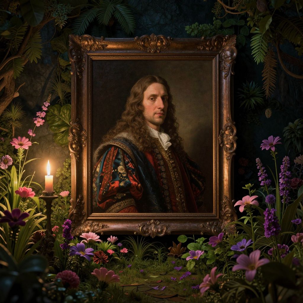 In this enchanting image, a painting in the style of Rembrandt occupies the center, its intricate details and dramatic lighting creating an epic atmosphere. The painting, framed in an ornate, dark frame, depicts a man with long, curly hair, dressed in elaborate, colorful clothing. Surrounding the painting is a lush, magical garden filled with vibrant flowers in shades of pink, purple, and green, their textures and shapes meticulously rendered. A single candle, casting a warm, luminous glow, stands to the left, its light illuminating the scene and enhancing the depth of field. The garden and painting are set against a dark, moody background, with the light source creating a dramatic contrast. The overall composition, with its intricate details, volumetric lighting, and deep perspective, evokes a cinematic, photorealistic quality, reminiscent of a high-end studio photograph taken with a 70mm lens. The scene is a harmonious blend of natural beauty and artistic elegance, captured with the precision of a 3D rendering using the Unreal 5 engine and post-production techniques.