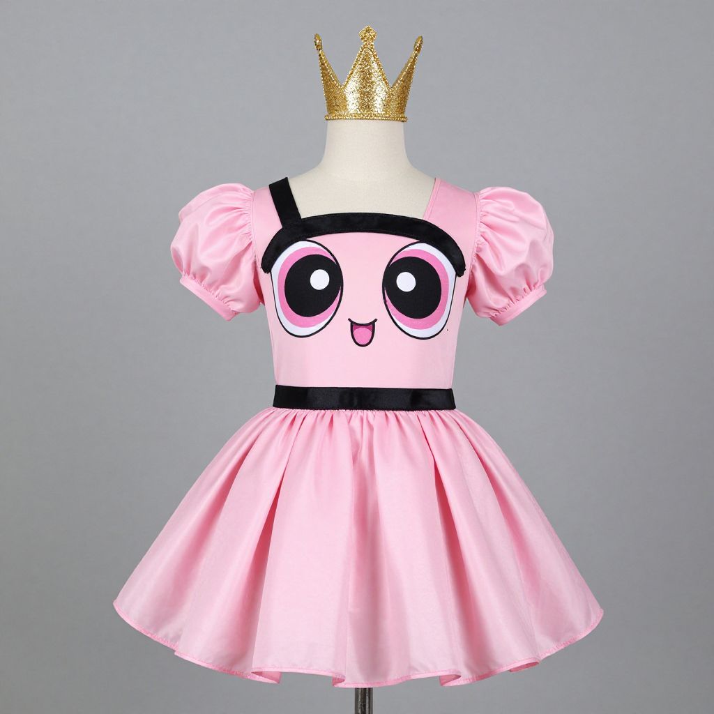 Pink cartoon princess dress with puffed sleeves, black straps, and large eyes, adorned with a gold crown on a white mannequin.