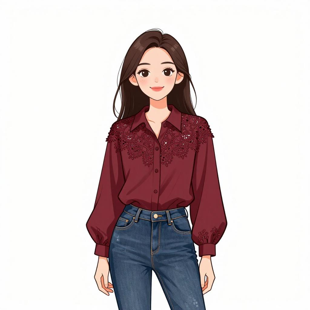 Woman with pretty face and pretty hair. smiling Woman, casual, black button-up blouse with crochet lace panel on shoulders, long sleeves with buttoned cuffs, light blue skinny jeans, simple hair down style. --sref 1467