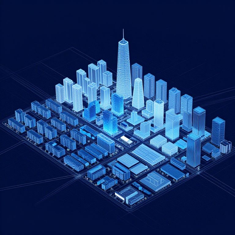 Cityblueprint visualization with 3D wireframe render of an urban environment, including residential, commercial, and industrial zones highlighted in various shades of blue, set against a deep navy starry sky, evoking a sense of technological advancement.