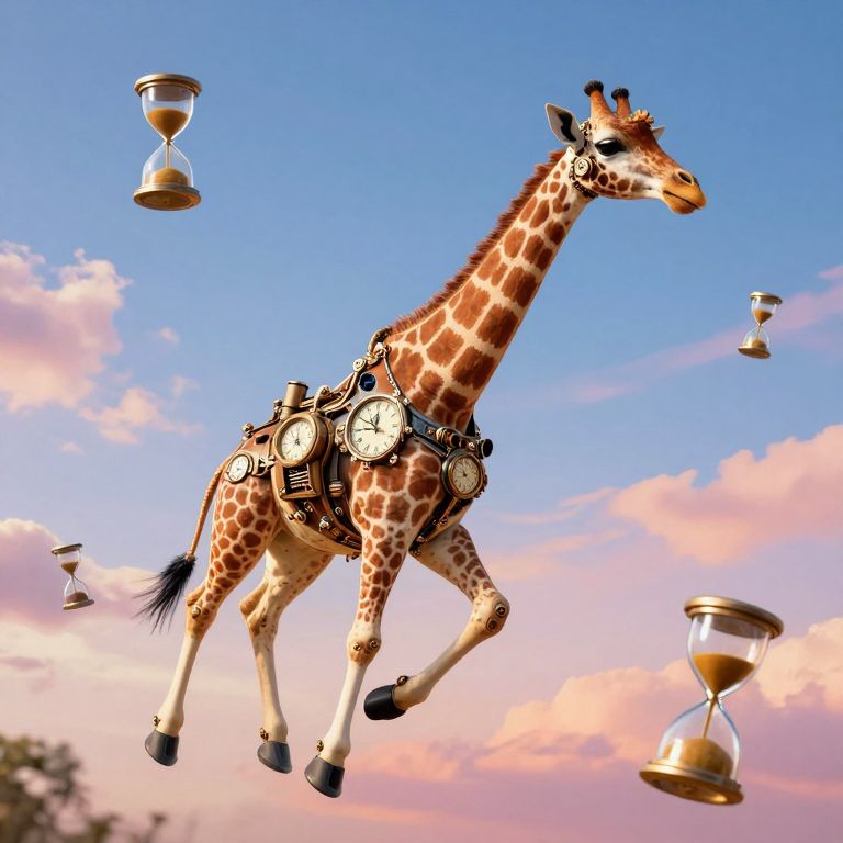 In a whimsical digital art rendering, a clockwork giraffe adorned with steampunk-inspired machinery soars gracefully through a vibrant sky, its hooves equipped with mechanical jets and surrounded by floating hourglasses, symbolizing a fantastical defiance of time.