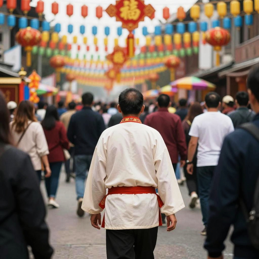 Walking against the crowd during a festival, lone figure in traditional clothing steadily navigating through a vibrant, colorful throng celebrating, festive decorations, energetic composition