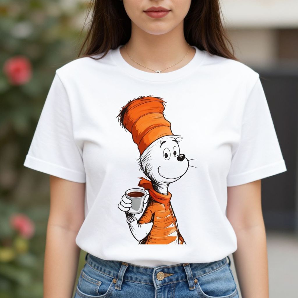 Photograph of a young woman from the chest down, wearing a white short-sleeved T-shirt with a black and orange cartoon-style print of the character The Cat in the Hat. The Cat has a tall, orange, cone-shaped hat and is holding a small white cup in his right hand. He wears an orange shirt. The woman has fair skin and is wearing blue jeans with a button and zipper. Her long brown hair is down, and she stands against a blurred outdoor background with greenery and pink flowers. The T-shirt is slightly cropped, showing a bit of her midriff.