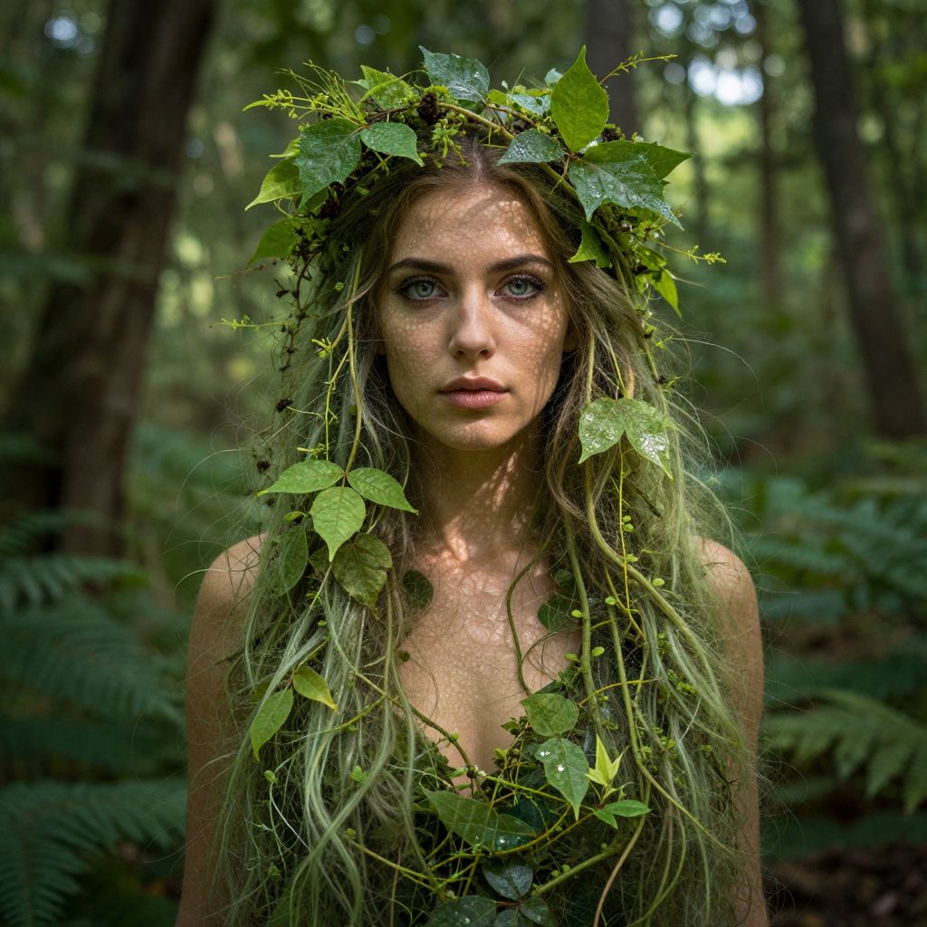 Photograph of a young woman with long, green-leaf adorned hair, wearing a leafy crown, standing in a lush, forested background.