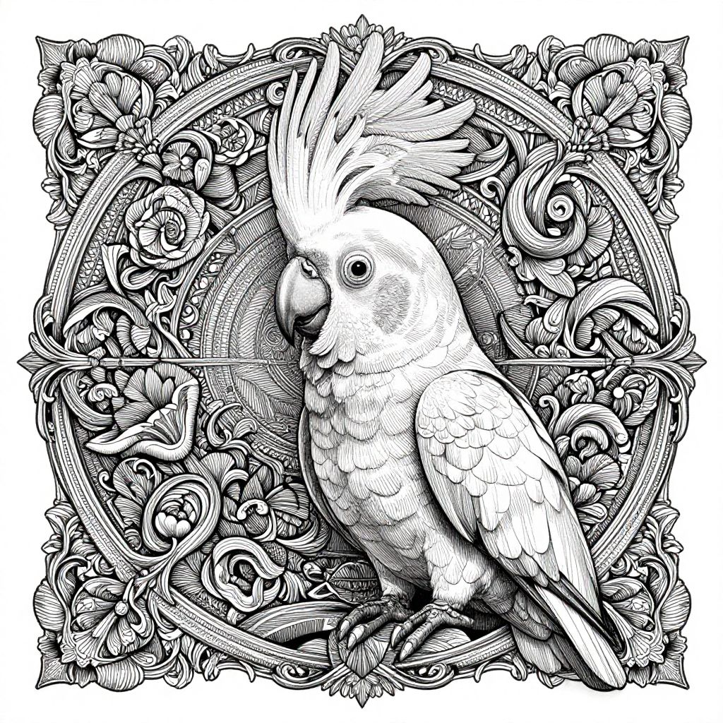 Intricate black and white drawing of a cockatoo with a crest, surrounded by elaborate, swirling floral patterns and detailed textures.