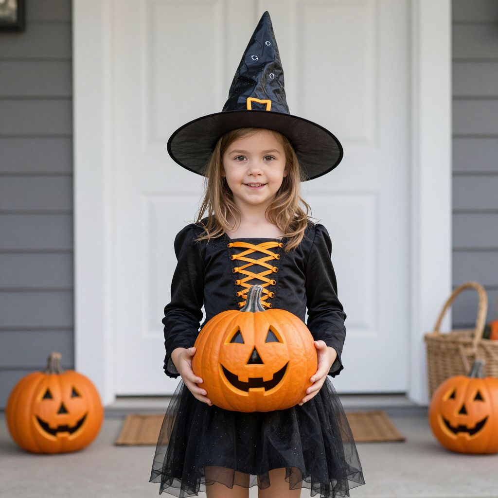 Photograph of a young girl in a black witch costume with orange lacing, holding a carved pumpkin, standing on a porch.