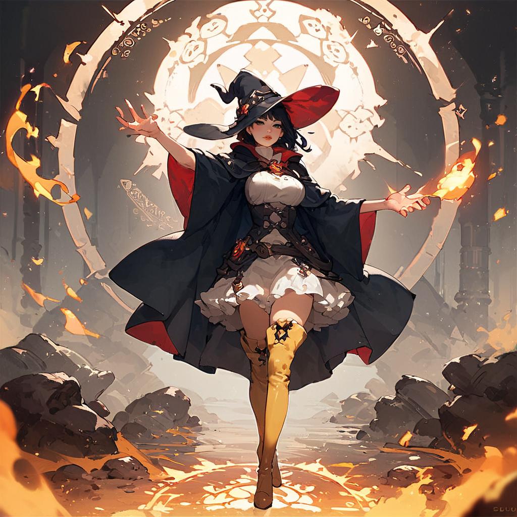 Score_9, score_8_up, score_7_up, source_anime, 1girl, shizuka masou, dungeon, dim lighting, cloak, yellow thigh boots, witch hat, standing, outstretched arm, casting spell, fire spell, serious
