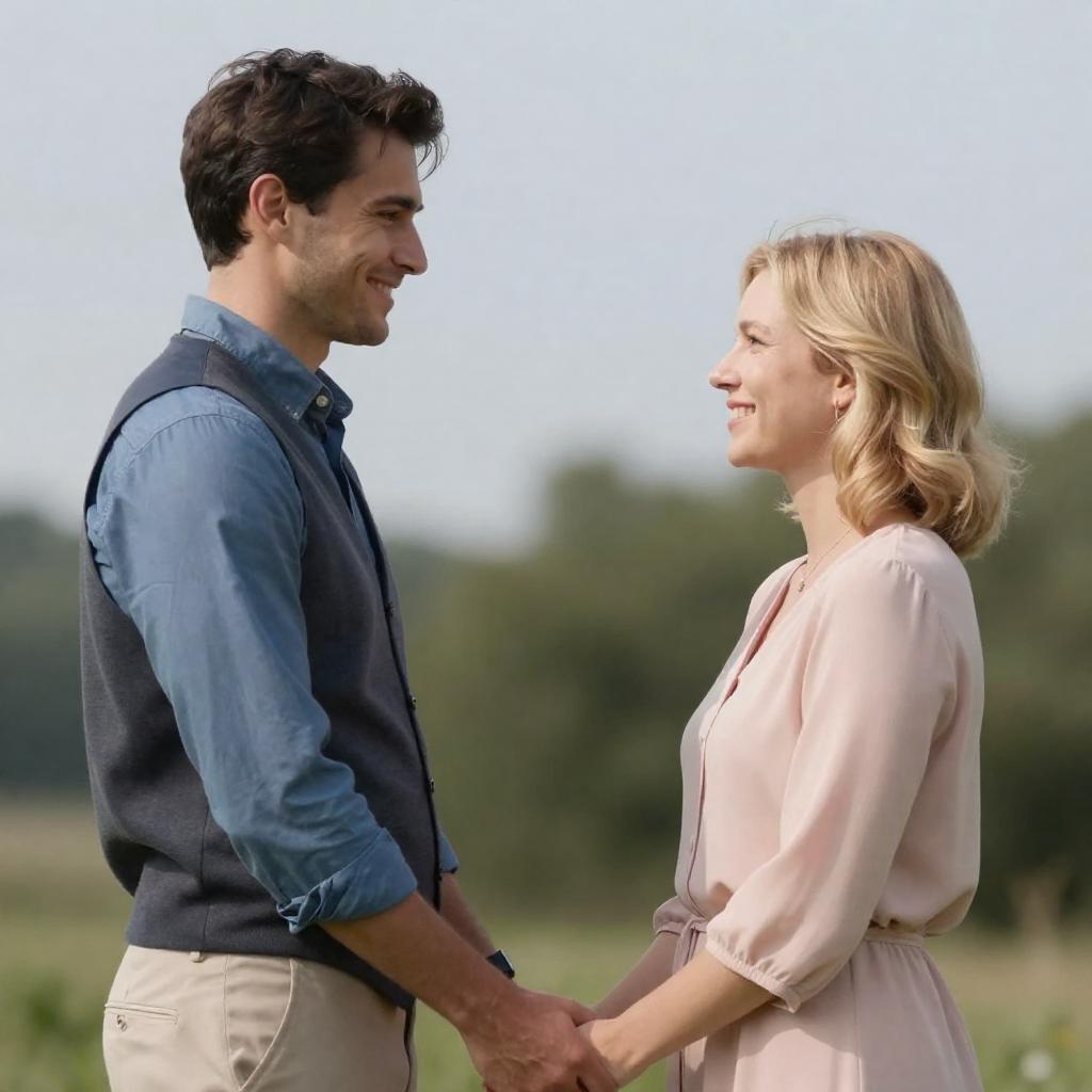 Photograph of a woman with blonde, wavy hair in a beige cardigan and green scarf, laughing at a man with a brown hat and jacket, leaning against a vintage truck. The man looks at her with a slight smile. The truck's interior has ropes and boxes. The background is blurred greenery.