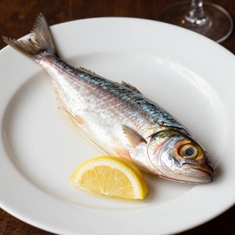 Photograph of a whole, silver-scaled fish with a large eye, lying on a white plate with a lemon wedge, set against a dark wooden