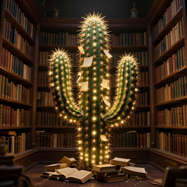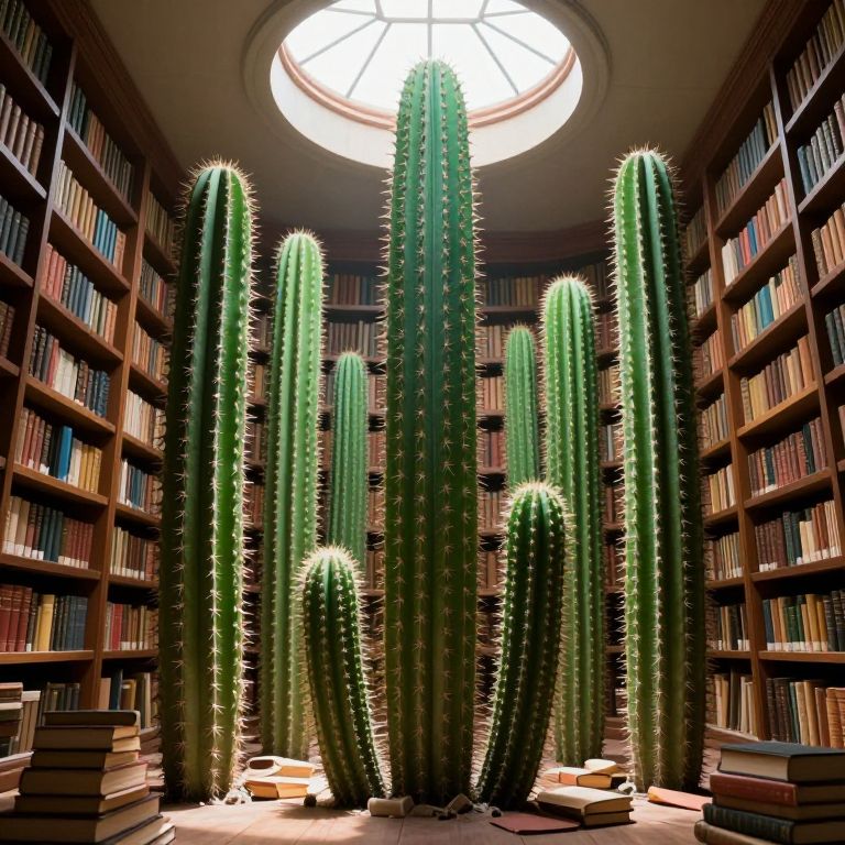 A colossal and sentient cactus grows from the center of an ancient bookshelf, its spines composed of glowing, living tomes that rewrite themselves hourly.