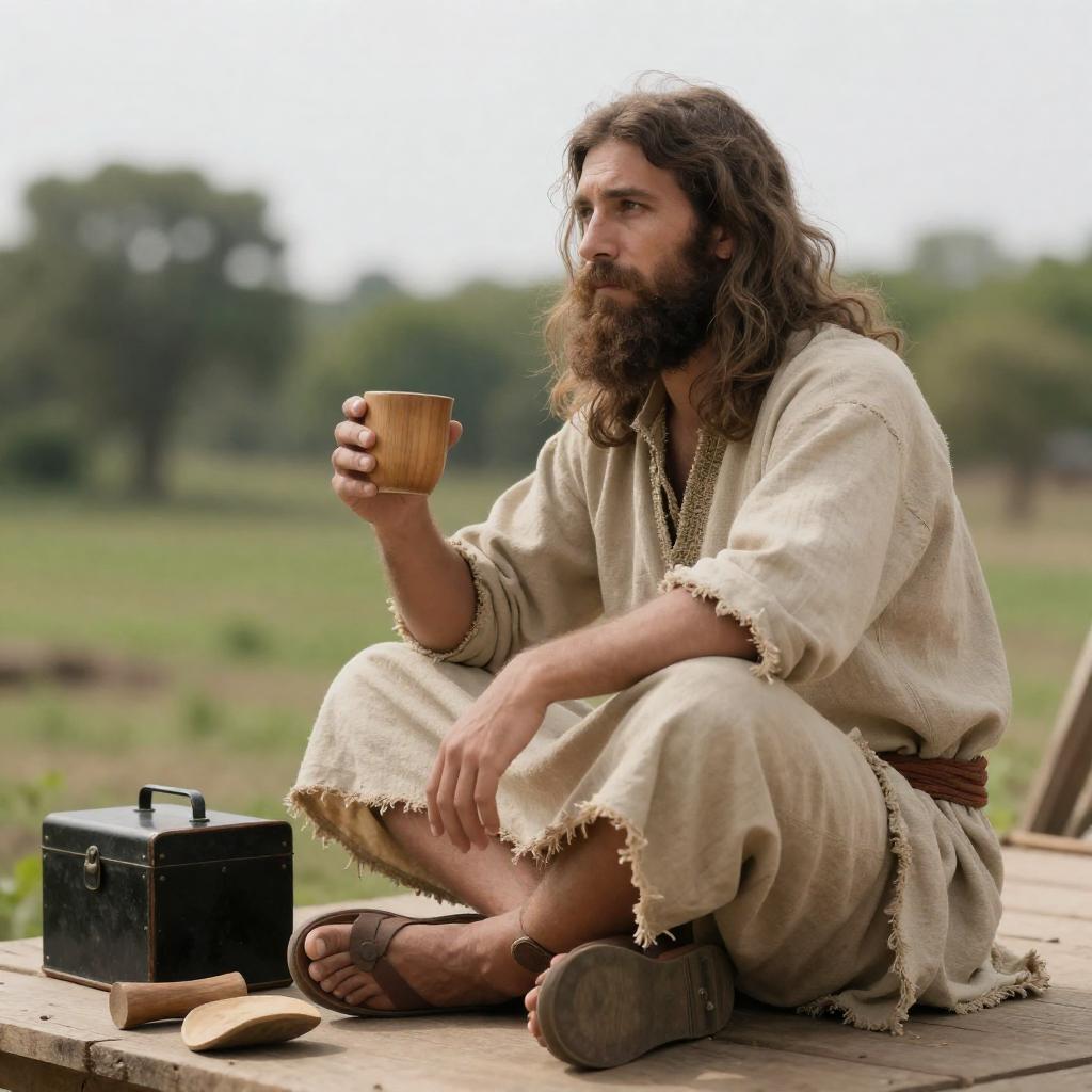 Realistic photo.Jesus holding a flail in a rebellious pose, with twilight lighting. The background includes stormy skies and deep blues. Focus on a defiant spirit. realistic photo
