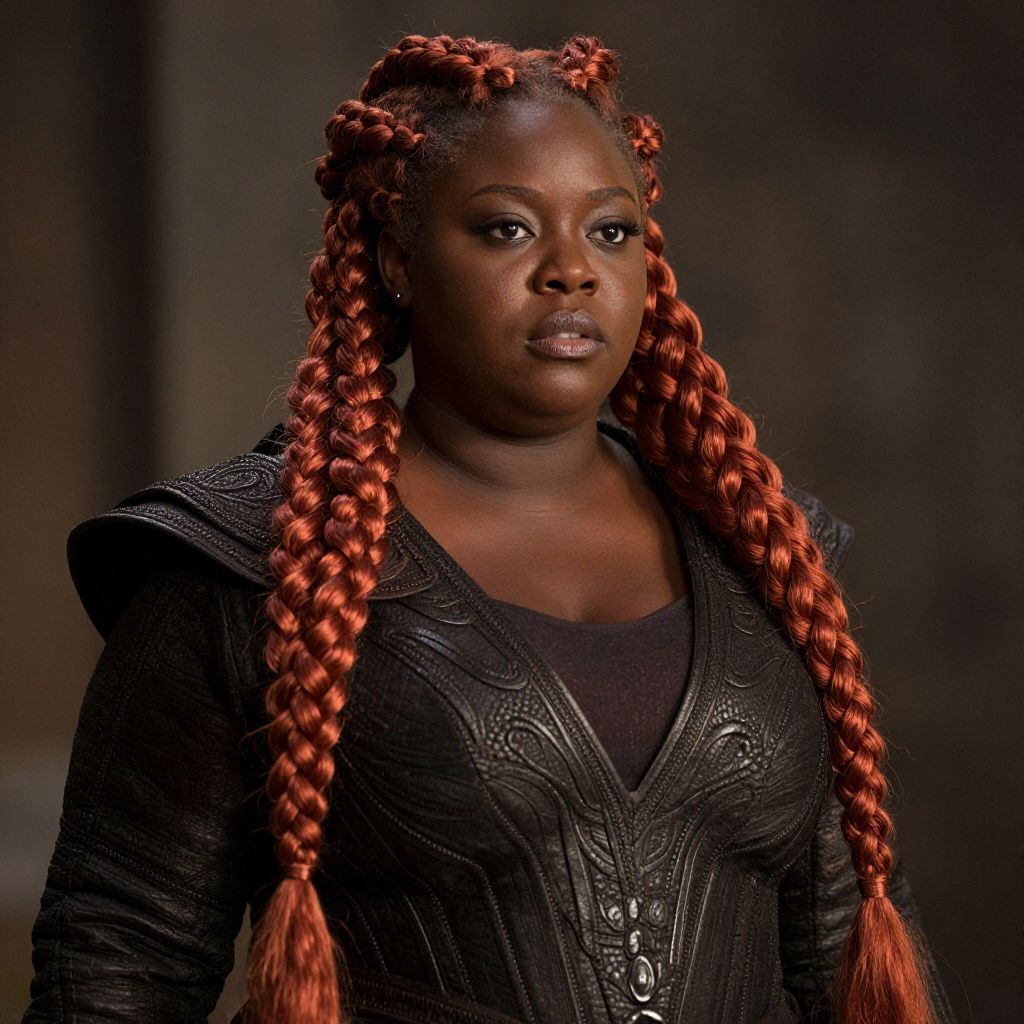 A fantasy photograph of a short, thick, stocky, beautiful black dwarf woman with heavy, thick, beautiful copper braids, wearing a dark, intricate outfit with cinematic lighting.