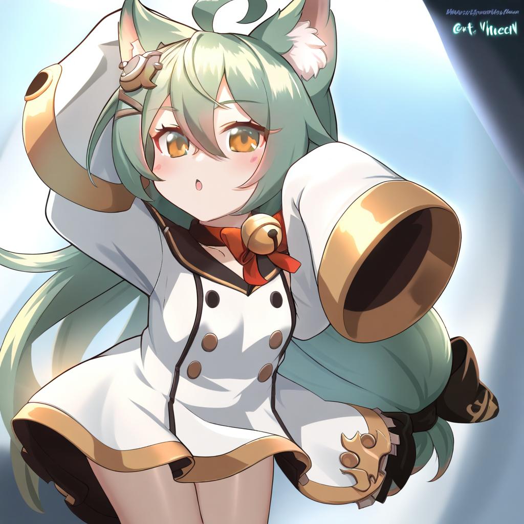 Akashi (azur lane), azur lane, 1girl, cat ears, animal ear fluff, yellow eyes, hair between eyes, mole under eye, green hair, very long hair, ahoge, hair ornament, hair bow, white dress, long sleeves, sleeves past fingers, jingle bell, by artist zanntetu, anime