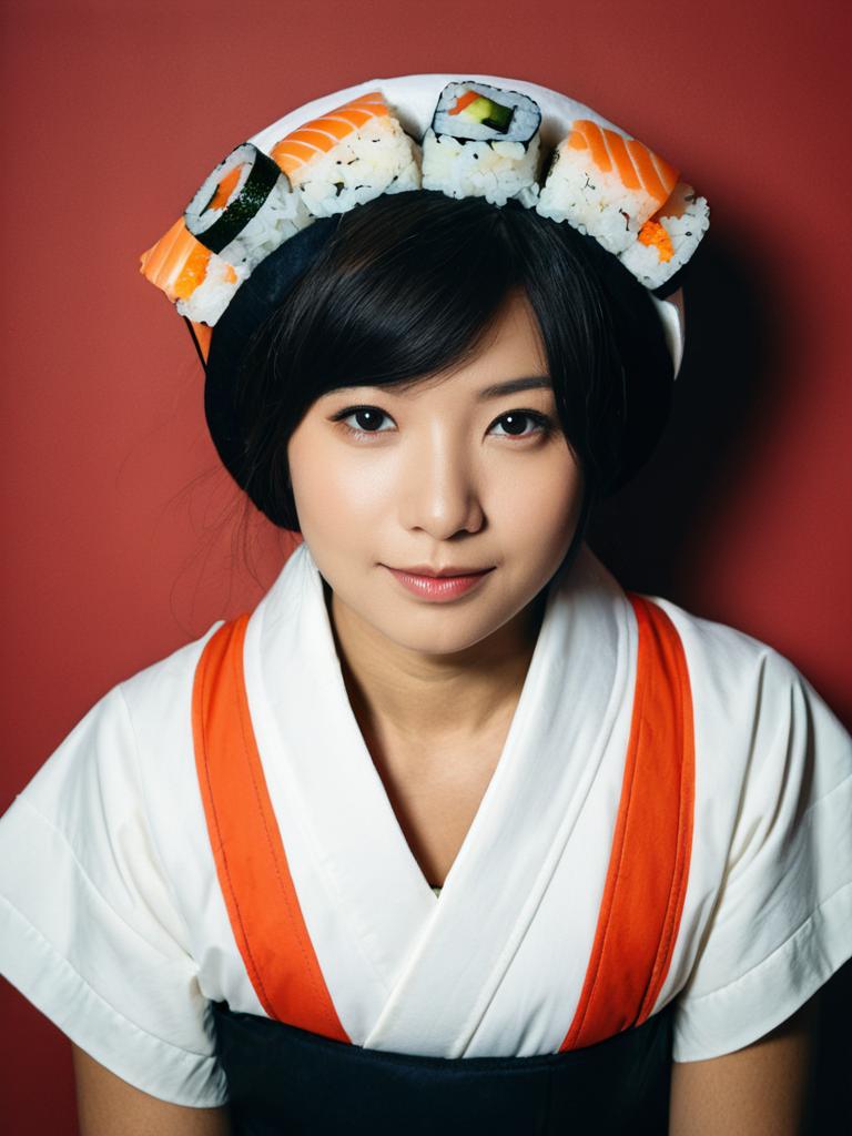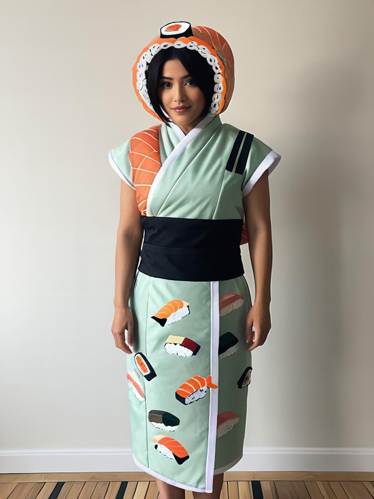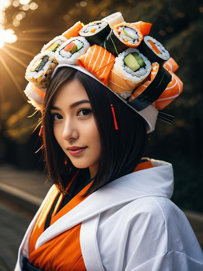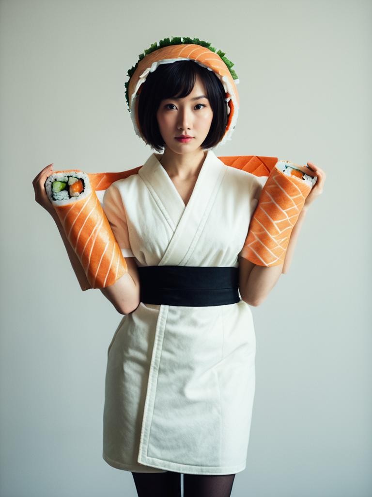 Person in Sushi Roll Costume, cinematic realism, playful comedic portrait --sref 1388
