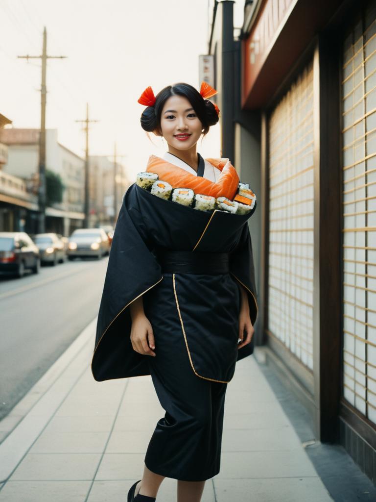A young East Asian woman wearing a colorful sushi roll costume stands smiling on a city street. The costume features large sushi elements such as salmon, rice, and roe, with a matching salmon hat. She is dressed in black pants and black shoes with a green long sleeve shirt underneath. The urban setting includes buildings and cars in the background.