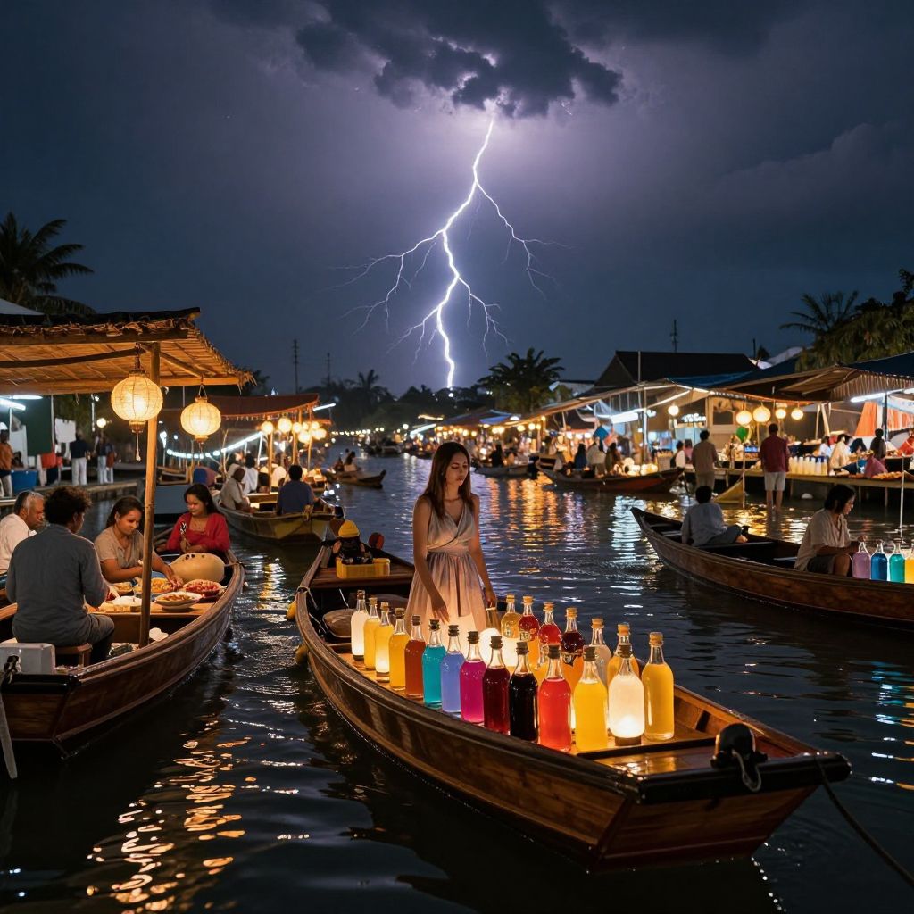In a nocturnal floating market illuminated by warm lanterns, vendors navigate the waterways beneath a stormy sky where lightning streaks like celestial fireworks, while a woman stands serenely amidst a boat laden with bottles of vibrant, mood-changing elixirs.