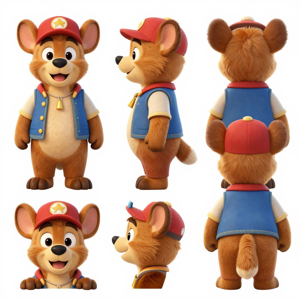 Disney character reference sheet depicting a lively anthropomorphic animal hero, detailed with front, side, and back views, including close-ups of facial expressions and costume accessories, rendered in bright, cartoonish colors with smooth shading.