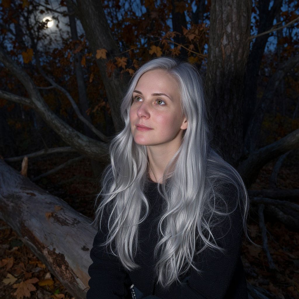 Photograph of a young woman with long, wavy silver hair standing in a dark forest at night. She has fair skin and wears a black sweater. Her expression is calm and slightly introspective. The background features tall trees with brown and orange leaves, and a large fallen log on the left. A faint moonlight illuminates the scene, creating a stark contrast between her silver hair and the dark surroundings. The overall mood is mystical and serene.