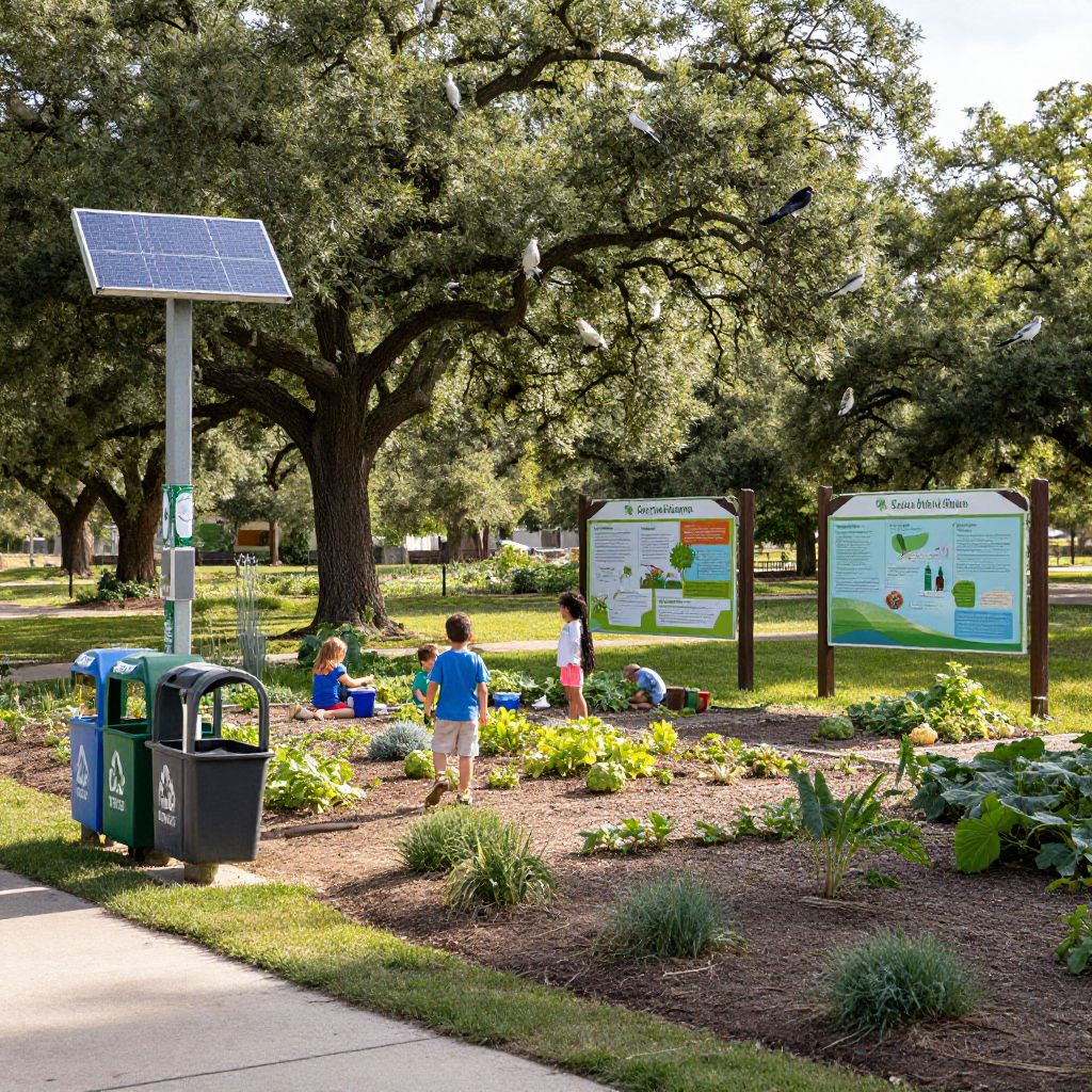 Eco park Plano with a focus on sustainability and nature preservation, featuring solar-powered light posts, recycling bins, children playing in an organic garden space, informational eco-boards, and birds nesting in tall oak trees on a warm sunny afternoon.