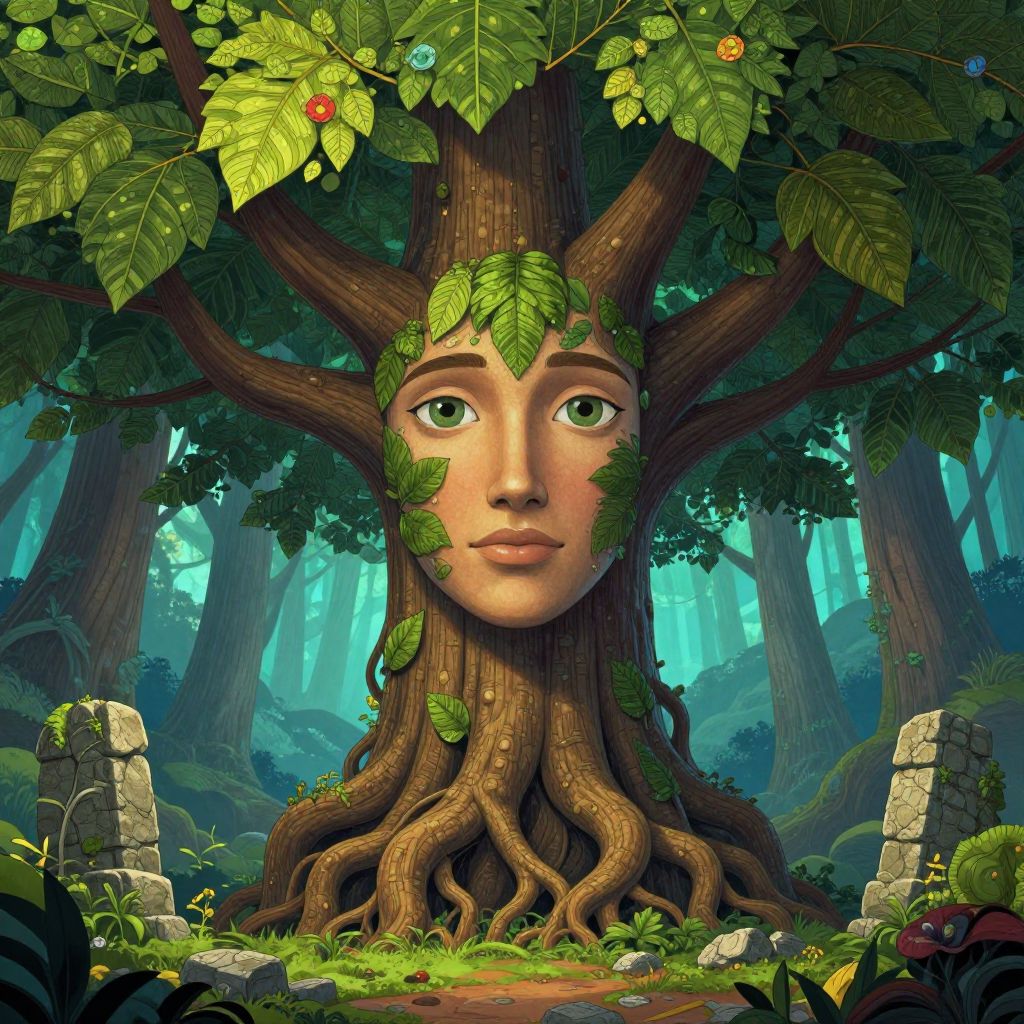 Kapital depicted as a massive tree with roots entwined around stacks of coins and paper money, leaves shimmering like precious gems, a serene sunrise illuminating the scene, digital painting with fine textures