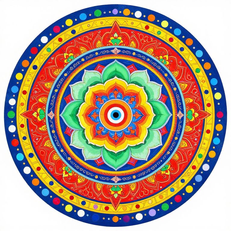 The image presents a vibrant and intricate mandala, a traditional spiritual and ritual symbol in Hinduism and Buddhism. The mandala is composed of multiple concentric circles and layers, each filled with a variety of colors and patterns. The outermost circle is a deep blue, adorned with a series of smaller, colorful circles and geometric shapes. Moving inward, the next layer features a bold red and yellow color scheme, with intricate patterns and floral motifs. The central part of the mandala is dominated by a large, symmetrical flower-like design, with petals in shades of green and yellow, and a central eye-like motif in red and orange. The overall composition is balanced and harmonious, with the colors and shapes creating a sense of depth and complexity. The mandala's design is both visually striking and spiritually significant, reflecting the balance and symmetry found in nature and the universe.