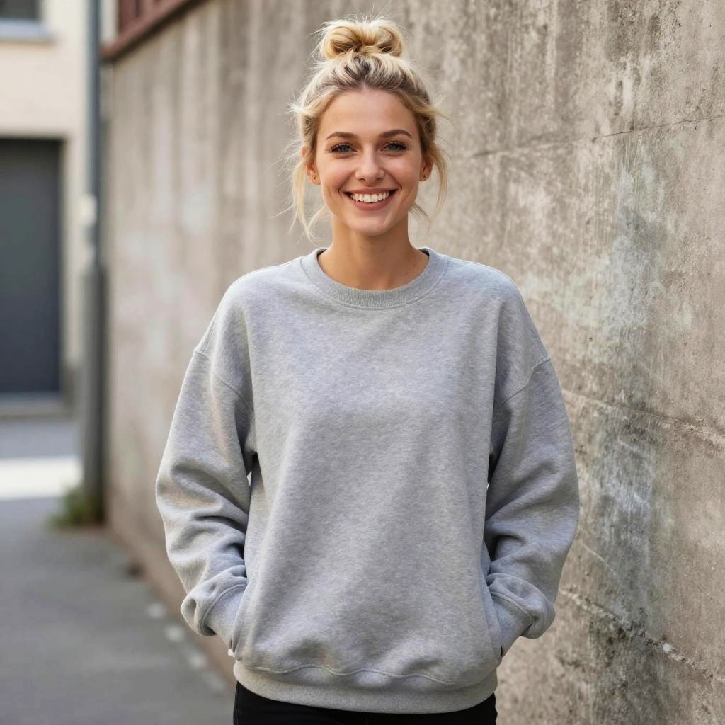 Photograph of a young woman standing outdoors against a concrete wall. She has blonde hair in a messy bun, blue eyes, and a bright smile. She's wearing a light gray, oversized sweatshirt with her hands in the pockets. The background shows an urban alley with a slightly shadowed, concrete building. The image has a casual, candid vibe with natural light highlighting her face.