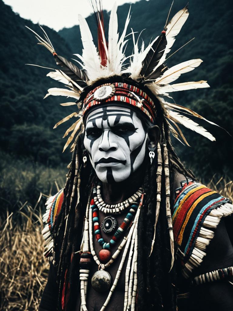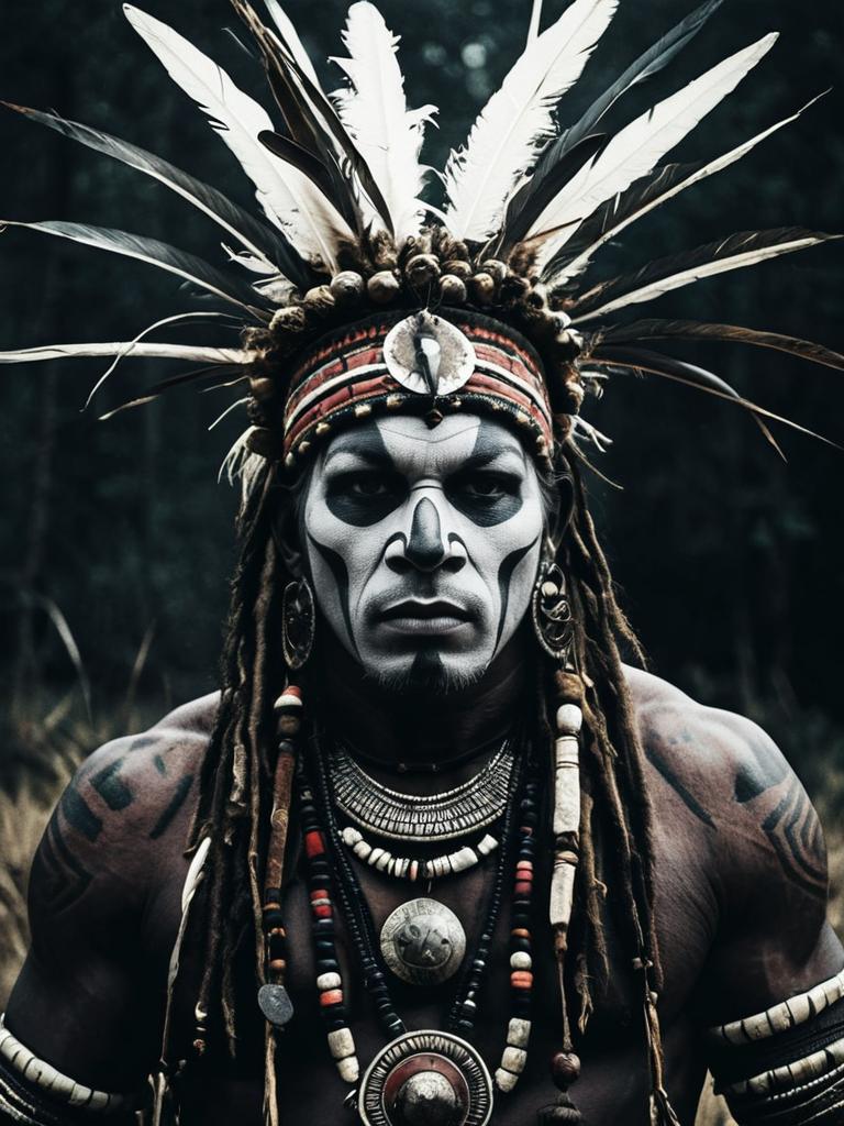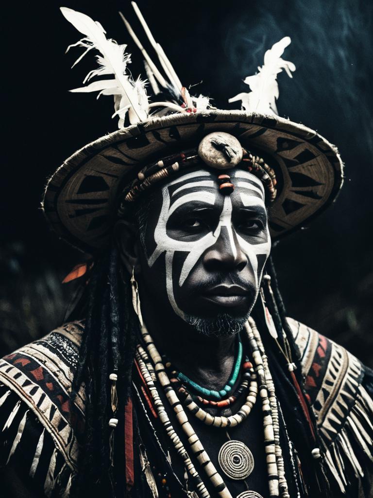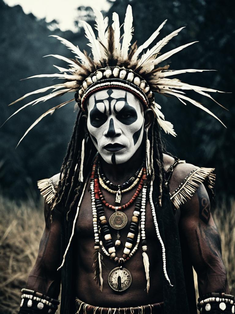 Man in Witch Doctor Costume, cinematic realism, dramatic tribal photo