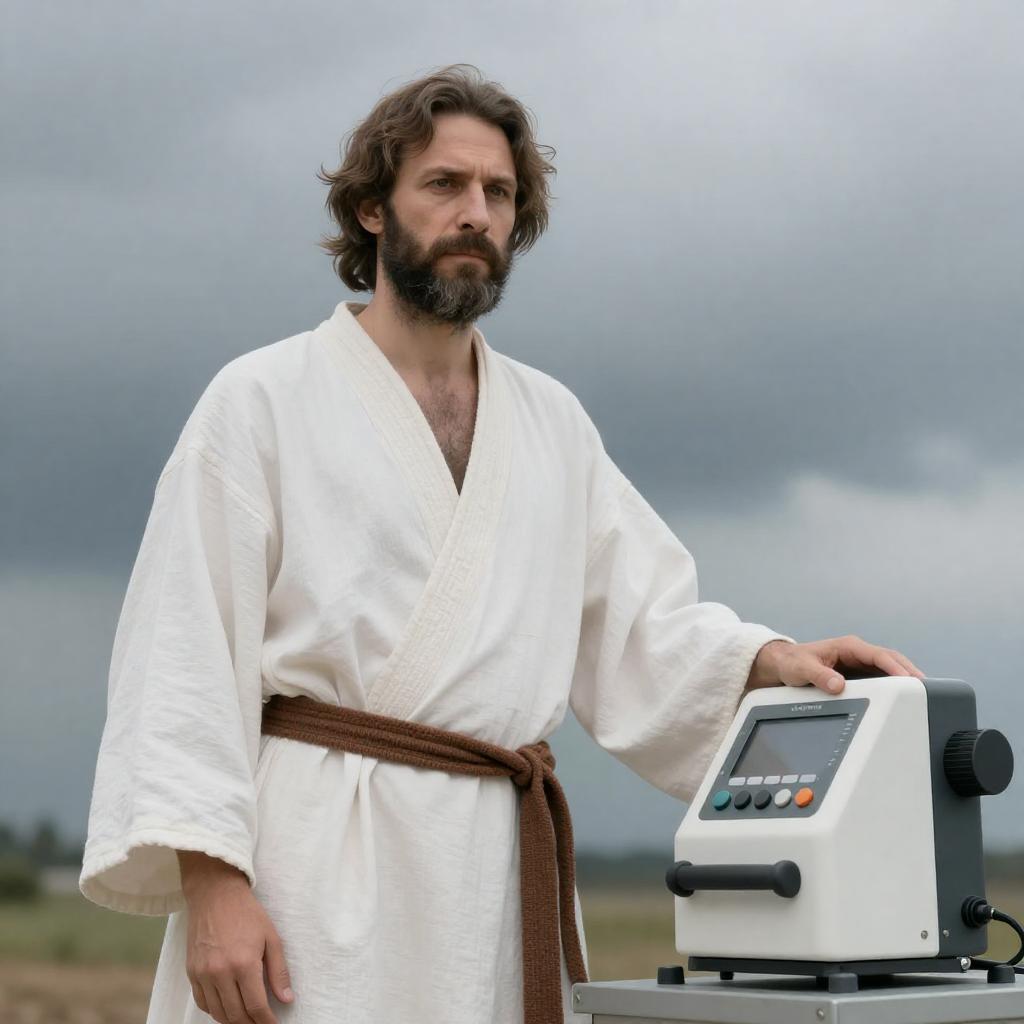 A photograph of a middle-aged man with a beard and shoulder-length brown hair, wearing a white, loose-fitting robe and brown belt, standing beside a large, white, mechanical device with buttons and a handle. His left hand rests on the device. The background is a cloudy, grey sky. His expression is neutral. The man is positioned on the left, and the mechanical device is on the right.