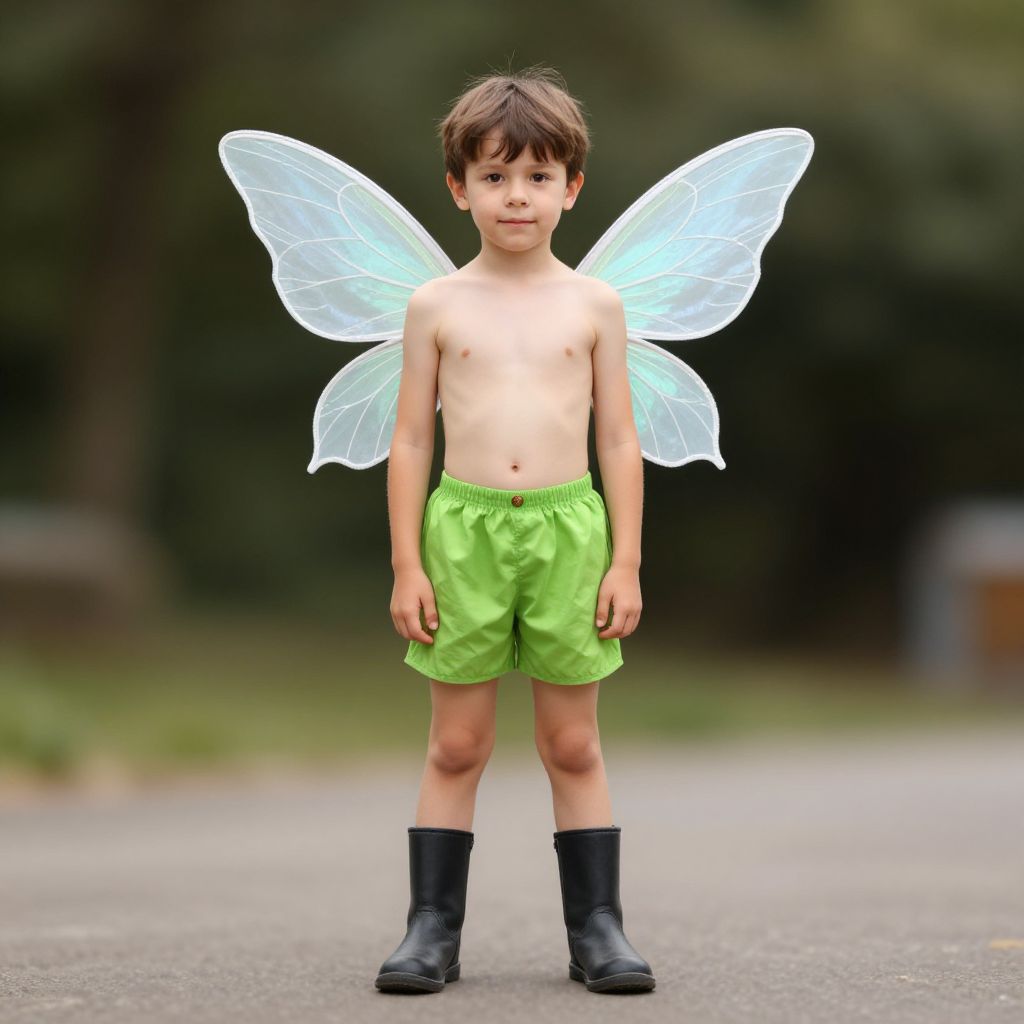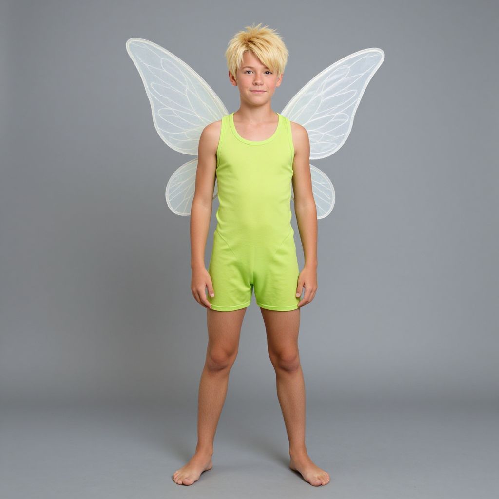Funny tinkerbell costume, male focus, 1boy, wings, solo, blonde hair, fairy wings, fairy, full body, tank top