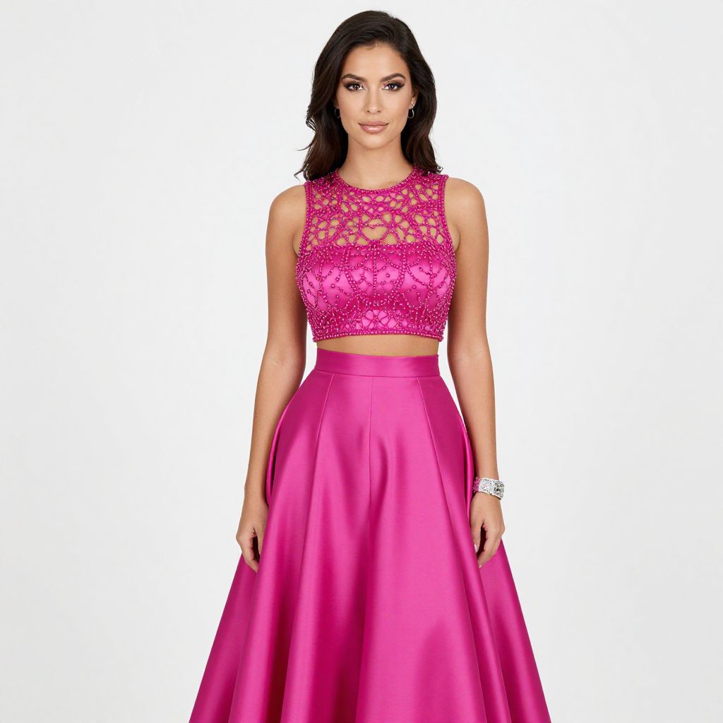 "Woman, formal event, two-piece ensemble in vibrant magenta, cropped sleeveless top adorned with intricate beadwork and cut-out details, round neck, matching high-waisted floor-length skirt, full and pleated, satin finish, silver bracelet, white background.. Sexy. Pretty face and beаutiful eyes. Big breasts."