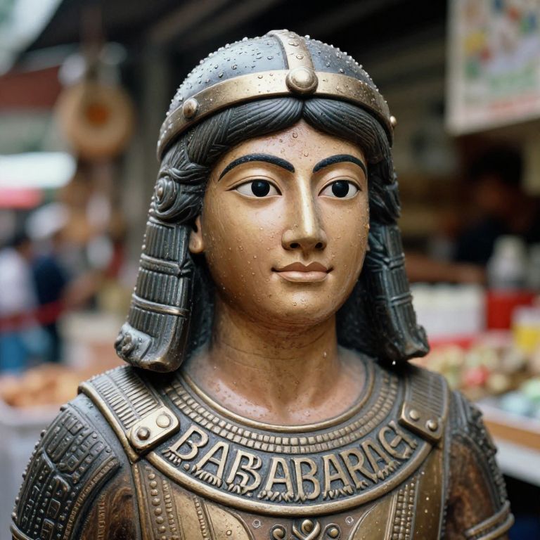 Hyperrealistic photograph of a Babylonian art statue displayed in a wet market in Singapore. The statue features detailed facial features with water droplets visible on its surface, wearing traditional Babylonian attire and helmet. The background shows a blurred market scene.