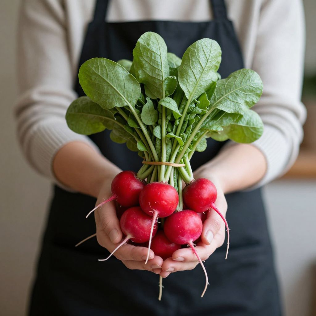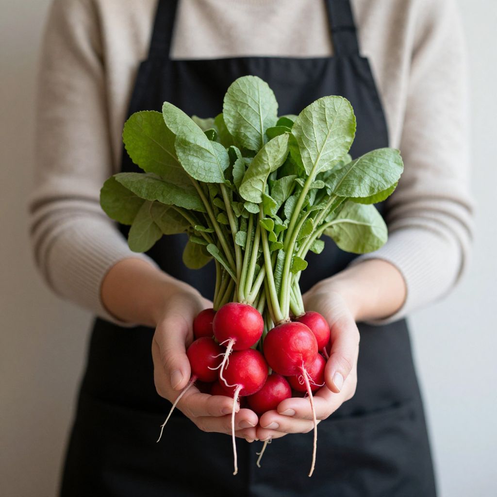 Woman wearing a beige sweater and black apron presents a vibrant bunch of fresh radishes, their bright red bulbs and green leafy tops cradled gently in her hands.