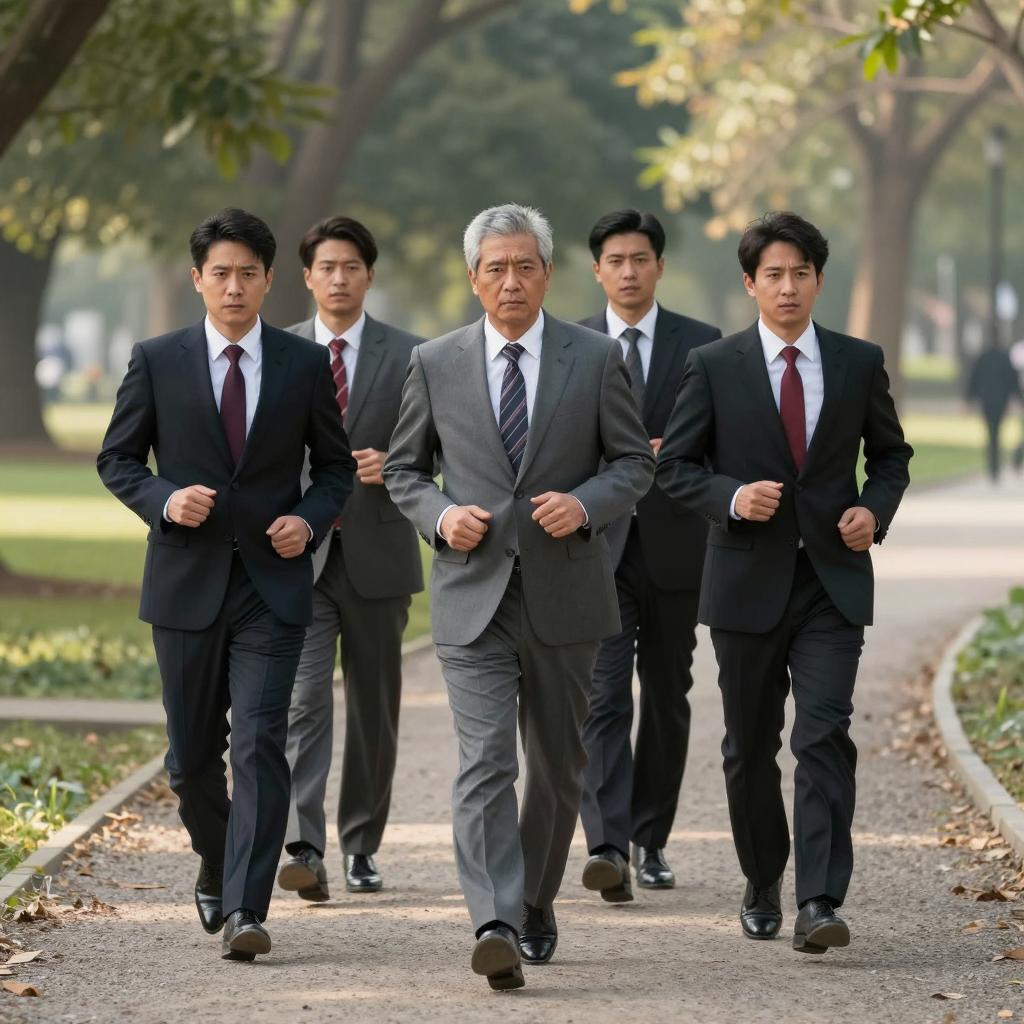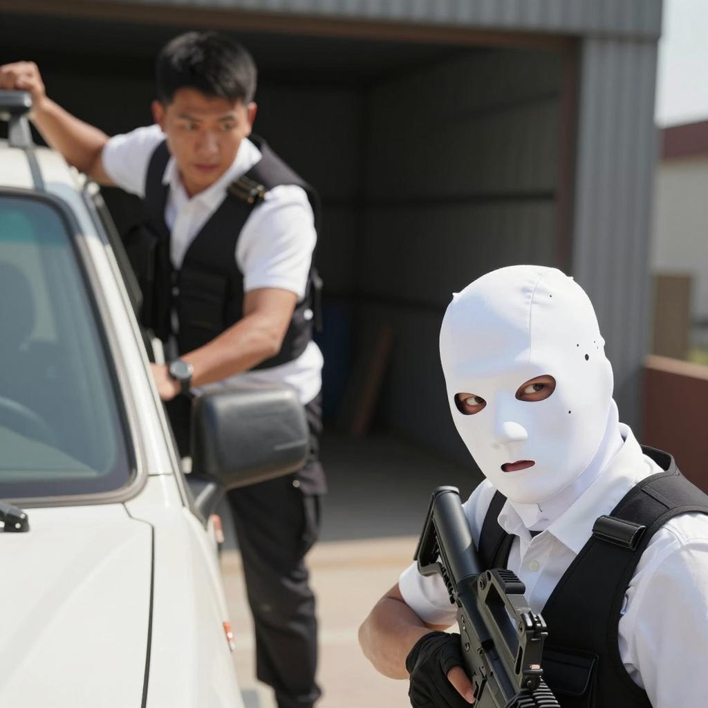 Photograph of three men in a car. Middle man with gray hair, gray suit, white shirt, black tie, leaning on seat. Left man in blue police uniform with yellow buttons, white shirt, black tie, white face. Right man with dark hair, beige shirt, gray striped tie, holding car controls. Dark interior, city lights in background.