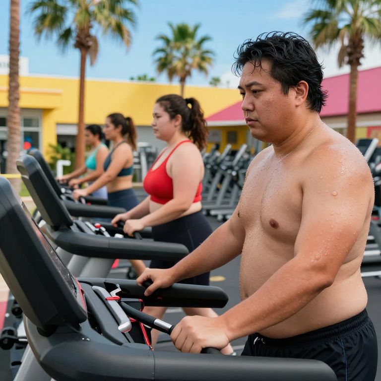 Ukiyo-E palm springs vibe. colorful. group of people. different size bodies. working out. overweight. thin. hyperrealistic. sweating. weights. treadmill. photographic,