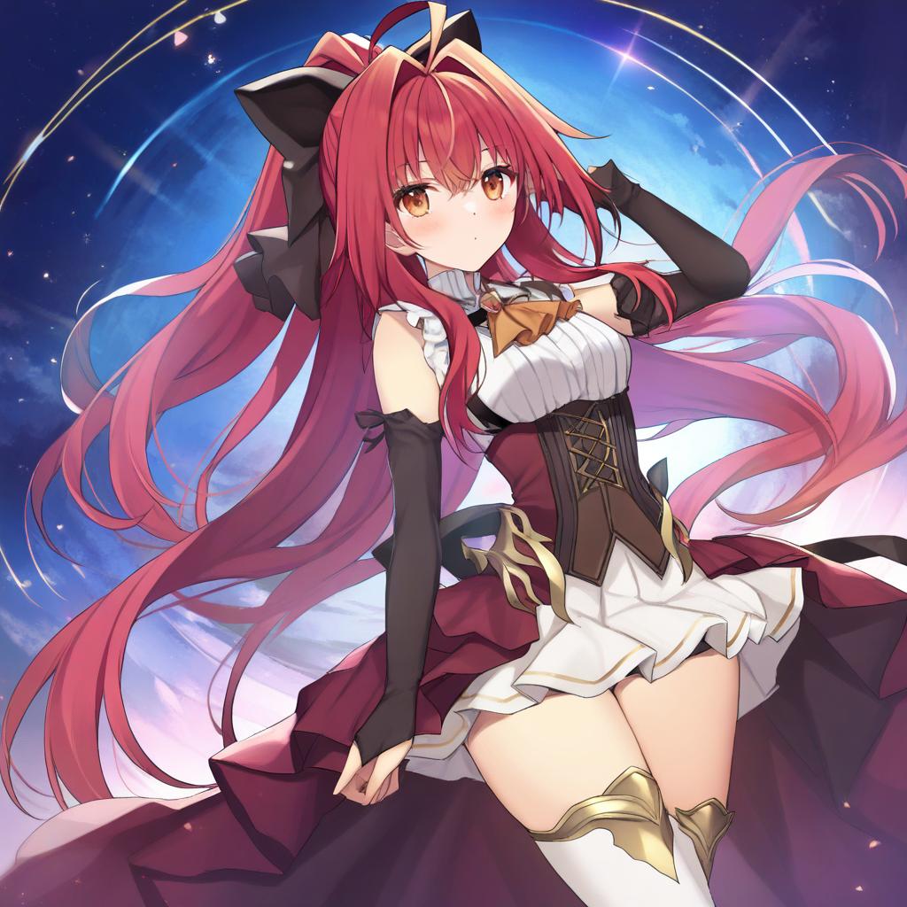 Corticarte apa lagranges, shinkyoku soukai polyphonica, 1girl, red eyes, red hair, very long hair, long hair, ahoge, ponytail, hair intakes, by artist ruhika, animagine