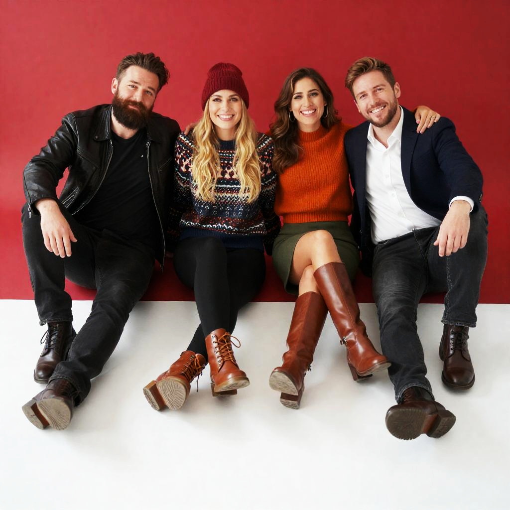 Photograph of four people sitting on a red and white divided surface. Left: bearded man in black leather jacket, black pants. Center: blonde woman in red beanie, patterned sweater, black leggings, brown boots. Right: woman in orange sweater, green skirt, brown boots, man in navy blazer, white shirt, dark jeans. All smiling. Man on left leans back, arms on knees. Woman in center leans forward, arms around man in blazer. Red background.
