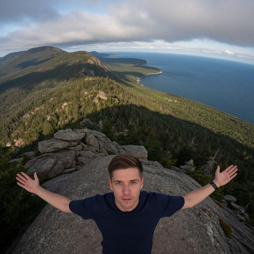 Panoramic view from above, capturing the serenity of Acadia National Park's rugged coastline, with the subject standing at the edge, arms extended, gazing out at the breathtaking vistas of mountains, forests, and ocean below, sunlight casting long shadows across the terrain, dramatic clouds gathering in the distance. Man has masculine face and piercing eyes