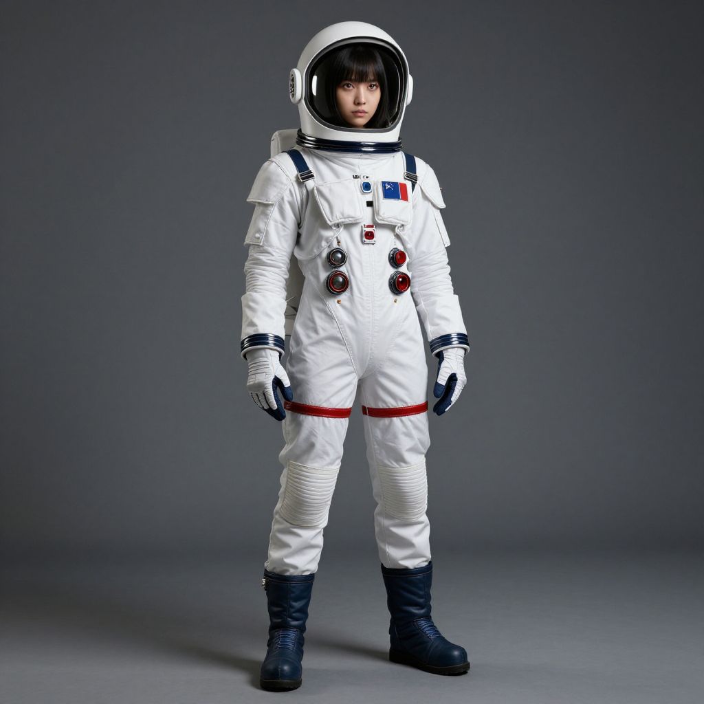 Photograph of a young Asian child standing against a plain grey background, wearing a white astronaut suit with a clear helmet, black gloves, and black boots. The suit has red and blue patches on the chest and white stripes on the sleeves and legs. The child has straight black hair with bangs, and a serious expression on their face. The astronaut suit is detailed with realistic textures and folds, giving it a professional appearance. The child is centered in the image, standing with their feet slightly apart, hands at their sides.