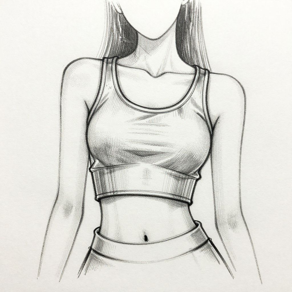 Black-and-white sketch of a woman's upper body, wearing a sports bra and high-waisted pants, with detailed line work, emphasizing her slim