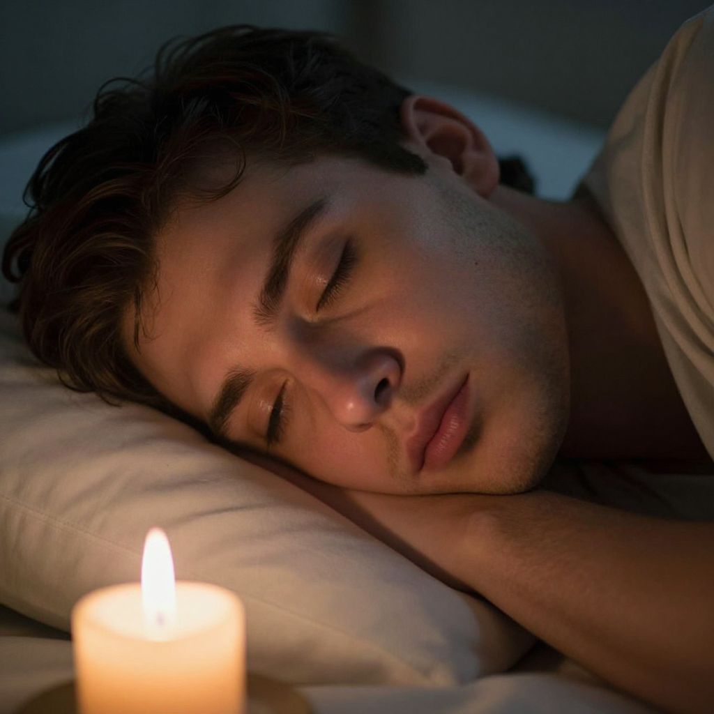 Photograph of a young man with short, dark brown, wavy hair, sleeping peacefully on a white pillow. His eyes are closed, and his expression is calm. He has light skin and a slight stubble on his face. He is wearing a light-colored, short-sleeved shirt. In the foreground, there is a lit, small, white candle with a warm, yellow-orange flame, casting a soft glow on his face. The background is dark, emphasizing the candlelight and the man's serene expression. The image has a peaceful, intimate atmosphere.