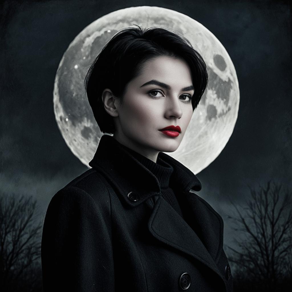 A portrait of a woman with short dark hair and red lips wearing a high-collared black coat, standing against a large pale full moon background in a dark moody noir style with painterly brushstrokes and muted gray and black tones, subtle red color accents