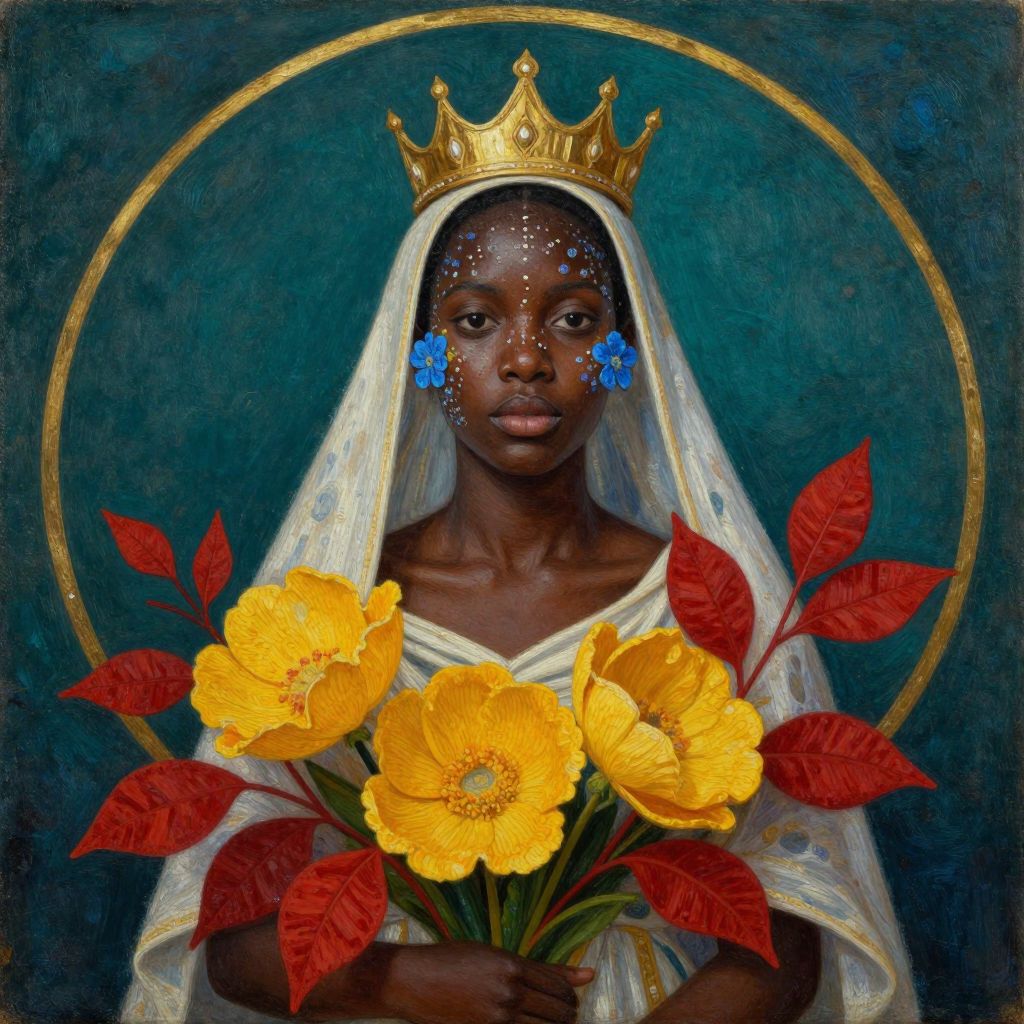 Digital painting of a dark-skinned woman with a regal presence, wearing a golden crown and white veil. Her face is adorned with blue flower-like markings and blue earrings. She holds a bouquet of bright yellow flowers with red leaves. The background is a rich teal, and a golden halo encircles her head. Her expression is serene and dignified, and the painting's style is realistic with a touch of surrealism, emphasizing her divine and ethereal qualities. The texture of the veil is delicate and flowing, contrasting with the vivid colors of the flowers.