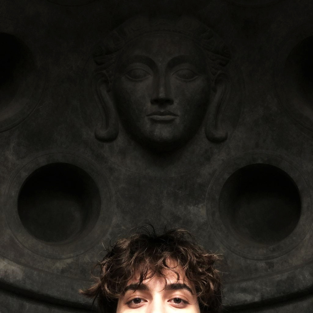 Dark stone ceiling with carved faces and circular openings, viewed from below by a person with messy brown hair. Person's back and head are visible, facing downward. Low, moody lighting. Two circular openings on the left and right.