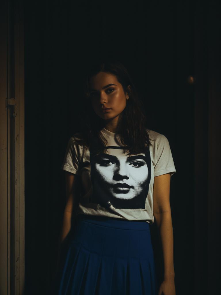 Portrait of a young woman wearing a white short-sleeve crew neck t-shirt featuring a monochromatic face print. She pairs the casual top with a cobalt blue structured mini skirt. The image is dark and moody with low light highlighting her face and upper body.