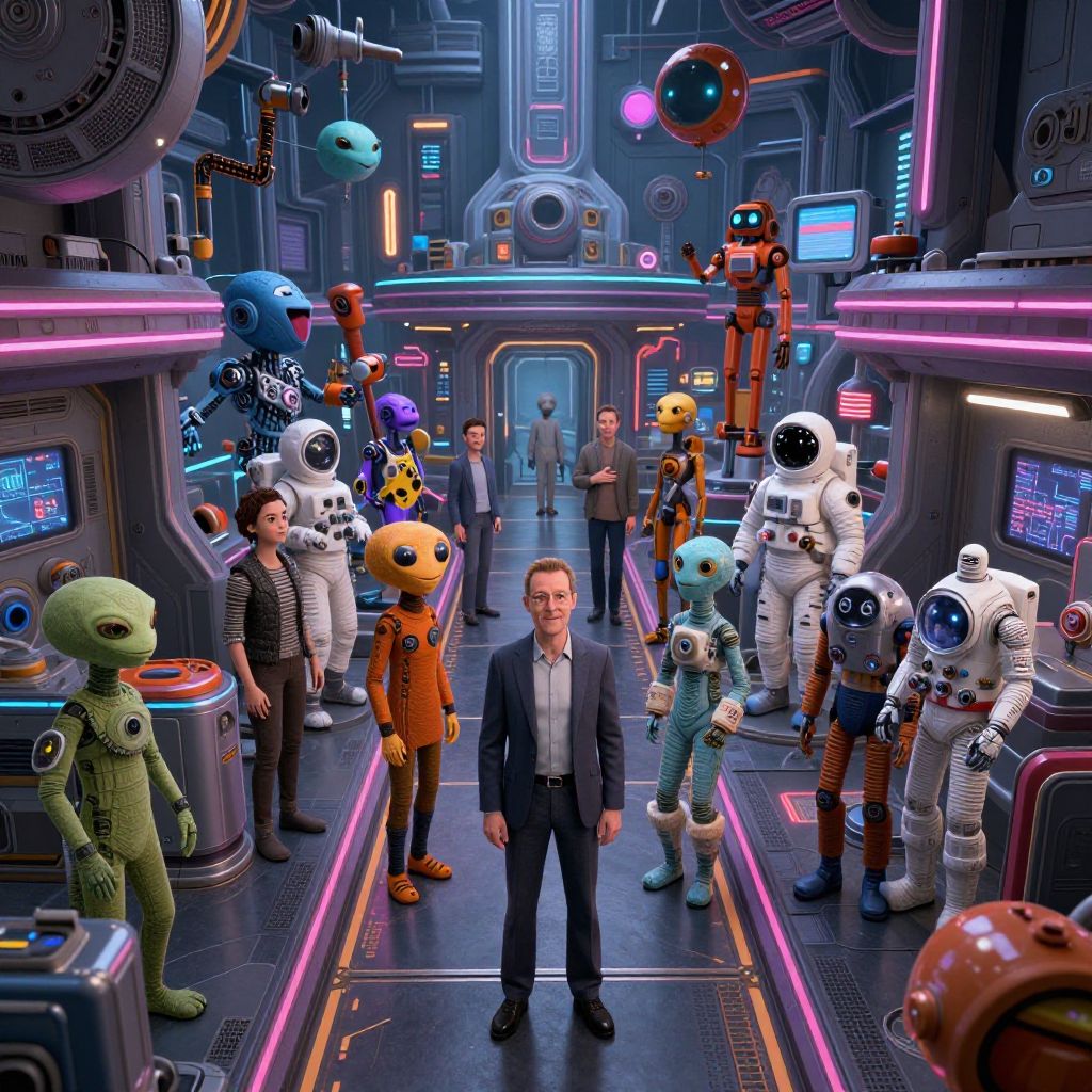 Photograph-style CGI: Man in black suit stands center in neon-lit sci-fi hallway, surrounded by diverse aliens and astronauts in varied outfits.